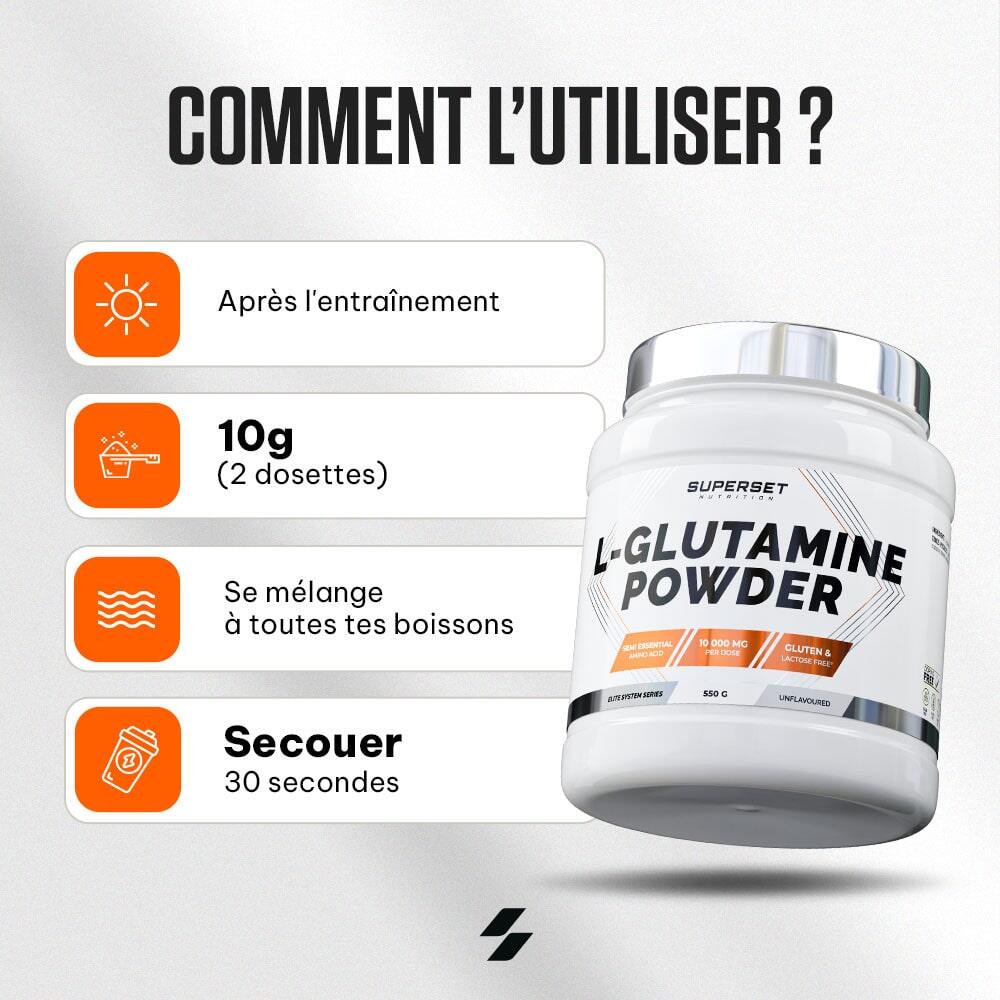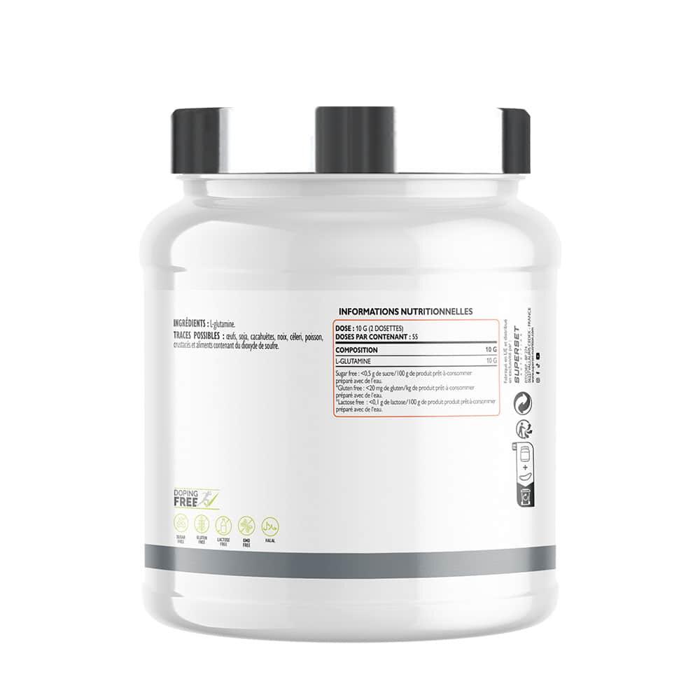 Why choose L-GLUTAMINE POWDER (550G)?L-GLUTAMINE POWDER (550G), developed by Superset Nutritionis distinguished by its 100% pure formula: only glutamine, with no additives or unnecessary ingredients.Designed for demanding athletes:It promotes recoveryHelps fight aches and painsHelps repair muscle fibresAs a result, you're back at your best faster, ready for a series of intense, high-performance sessions.With this glutamine, you can go beyond your limits and optimize every workout.An essential formula for athletesThe composition of L-GLUTAMINE POWDER (550G) offers an optimal dose of 10 g of pure glutamine per dose. This non-essential amino acid plays a key role in many processes linked to performance and muscle recovery, :Promotes rapid recovery by repairing muscle fibers after training, and reduces muscle soreness.Supports the maintenance of your muscle mass, essential for athletes seeking to progress while avoiding muscle degradation.Recharge your energy and limit fatigue before your next session.Boost your immunity, to maintain consistent performance even during periods of intense training.A must for lasting progress. A versatile ally for your sports routineWith its neutral taste and high adaptability, L-GLUTAMINE POWDER (550G ) can be easily integrated into your daily routine. Mix it with water, whey or any other beverage, without altering the taste.No strings attached, it's part of your routine, however you eat it. Its quality is guaranteed by its certifications:Anti-dopingLactose- and gluten-freeNo preservativesSugar- and sweetener-freeGMO-freeHalalThe perfect glutamine to help you reach your goals!