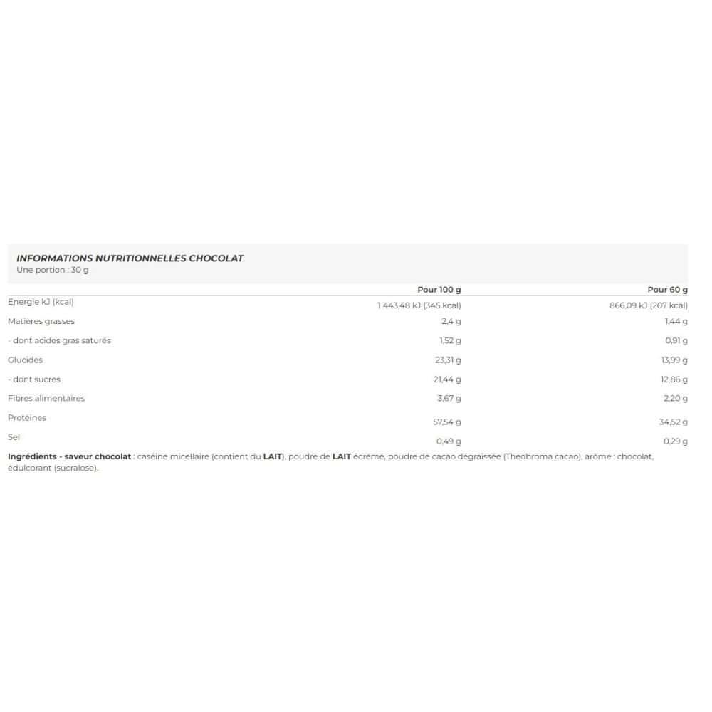 Ingredients - chocolate flavor: micellar casein (contains MILK), skimmed MILK powder, defatted cocoa powder (Theobroma cacao), flavor: chocolate, sweetener (sucralose).Ingredients - vanilla flavor : micellar casein (contains MILK), skimmed MILK powder, defatted cocoa powder (Theobroma cacao), flavor: cream, sweetener (sucralose).