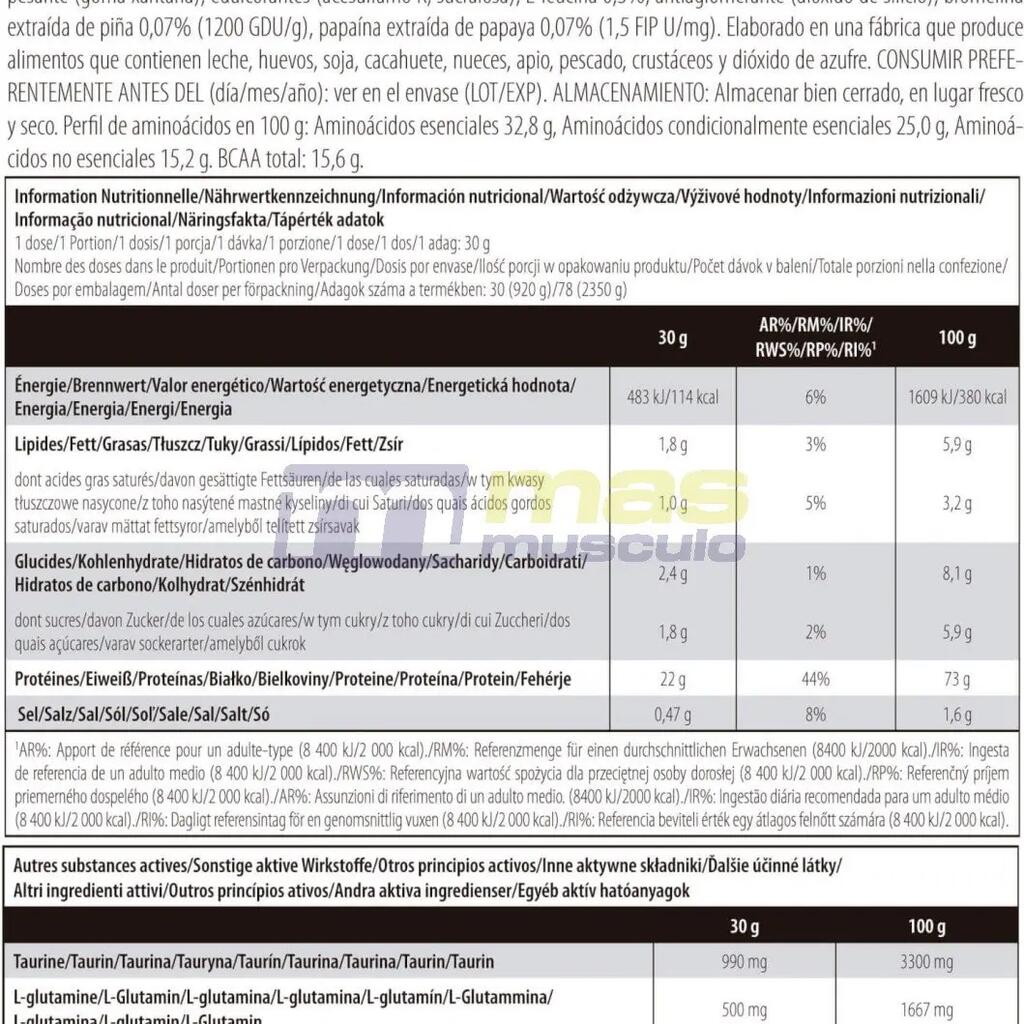 NUTRITIONAL INFORMATION Serving size: 30 g Per 30 g Per 100 g Kilocalories 111 to 114 kcal 370 to 382 kcal Kilocalories 470 to 484 kJ 1568 to 1608 kJ Fat 1.8 g 5.9 g - of which saturated fats 1 g 3.2 g Carbohydrates 2.5 g 8.4 g - of which sugars 1.8 g 5.9 g Protein 22 g 73 g Salt 0,39 g 1,3 g Taurine 990 mg 3300 mg L-Glutamine 500 mg 1667 mg L-Arginine 414 mg 1378 mg L-Leucine 100 mg 333 mg Bromelain 13 mg 43 mg Papain 13 mg 43 mg