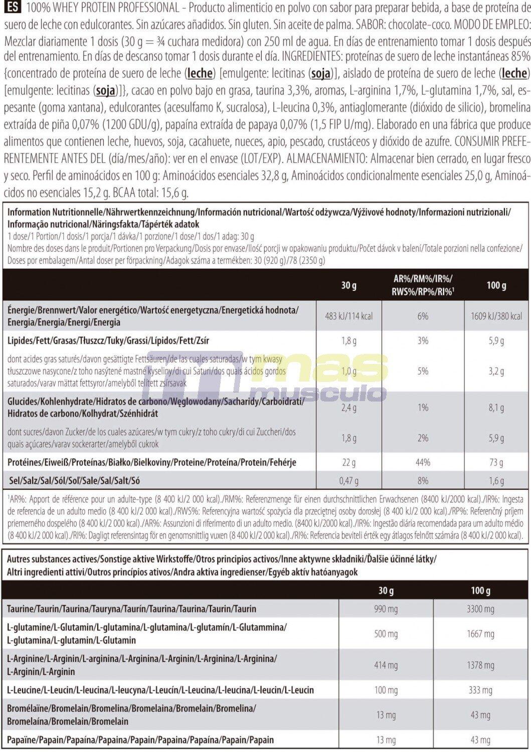 Chocolate: Instant whey protein 85% {whey protein concentrate(milk) [emulsifier: lecithins(soya)], whey protein isolate(milk) [emulsifier: lecithins(soya)]}, taurine 3.3%, low-fat cocoa powder, flavourings, L-arginine 1.7%, L-glutamine 1.7%, salt, thickener (xanthan gum), L-Leucine 0.3%, sweeteners (acesulfame K, sucralose), anti-caking agent (silicon dioxide), bromelain extracted from pineapple 0.07% (1200 GDU/g), papain extracted from papaya 0.07% (1.5 FIP U/mg). Vanilla: Instant whey protein 85% {whey protein concentrate(milk) [emulsifier: lecithins(soya)], whey protein isolate(milk) [emulsifier: lecithins(soya)]}, flavourings, taurine 3.3%, yoghurt powder(milk), L-arginine 1.7%, L-glutamine 1.7%, salt, thickener (xanthan gum), sweeteners (acesulfame K, sucralose), L-Leucine 0.3%, anti-caking agent (silicon dioxide), bromelain extracted from pineapple 0.07% (1200 GDU/g), papain extracted from Papaya 0.07% (1.5 FIP U/mg). Strawberry: Instant whey protein 85% {whey protein concentrate(milk) [emulsifier: lecithins(soya)], whey protein isolate(milk) [emulsifier: lecithins(soya)]}, flavourings, taurine 3.3%, L-arginine 1.7%, L-glutamine 1.7%, salt, acidifier (citric acid), sweeteners (acesulfame K, sucralose), L-Leucine 0.3%, thickener (xanthan gum), anti-caking agent (silicon dioxide), bromelain extracted from pineapple 0.07% (1200 GDU/g), papain extracted from papaya 0.07% (1.5 FIP U/mg), colorant (Ponceau 4R*).*Ponceau 4R: may have adverse effects on activity and attention in children.