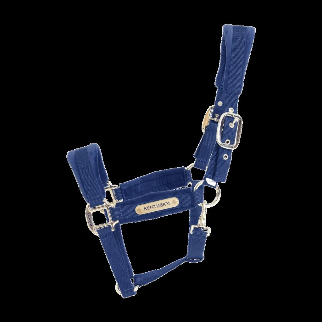 Discover the stylish and durable nylon halter with velvet details and gold-colored brass details ,including a personalized nameplate. Perfect to combine with all Kentucky velvet products.