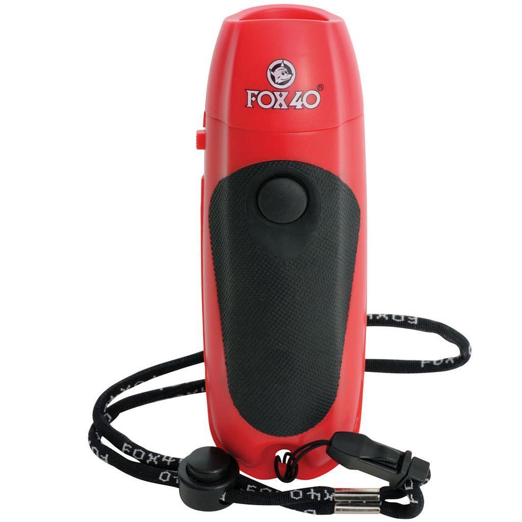 - The Fox 40 electronic whistle features a button that emits a loud, clear and constant sound. - Provides a hygienic solution for multiple operators. - Three distinct tones that can be directed in specific directions. - Sound power: 125 dB. - Includes detachable wrist cord and 9-volt battery.