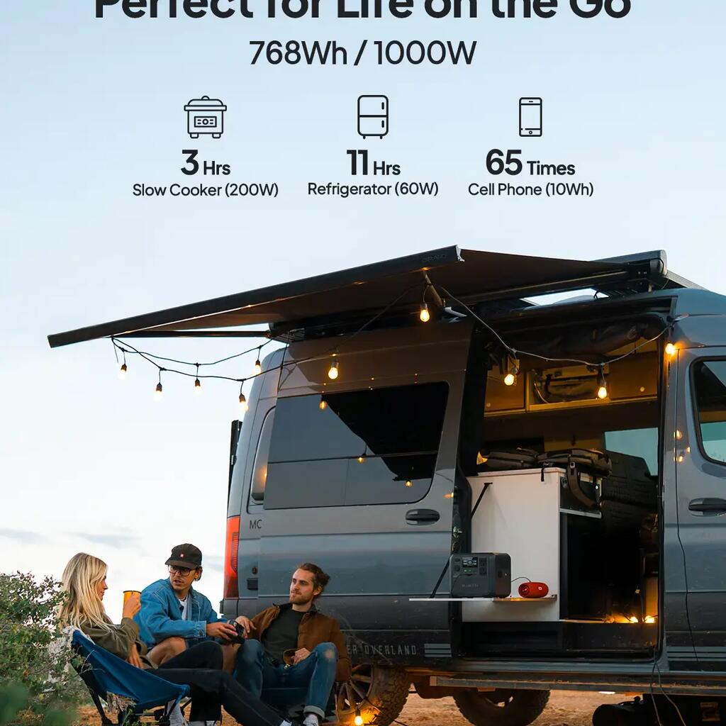 - Portable power capacity of 768 Wh – Ideal for camping, RV trips, and home emergency power supply