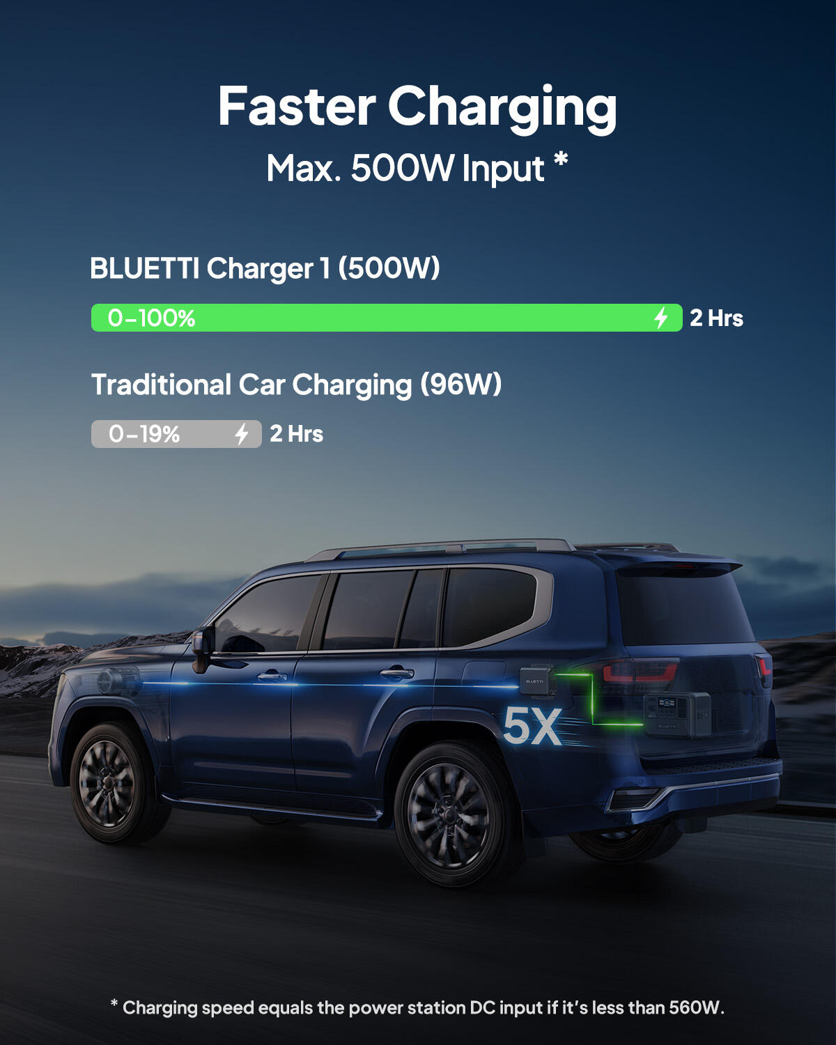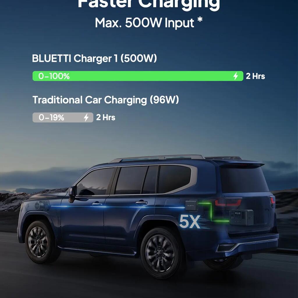 - Up to 500 W solar power input – Fully charged in approximately 2 hours using solar panels