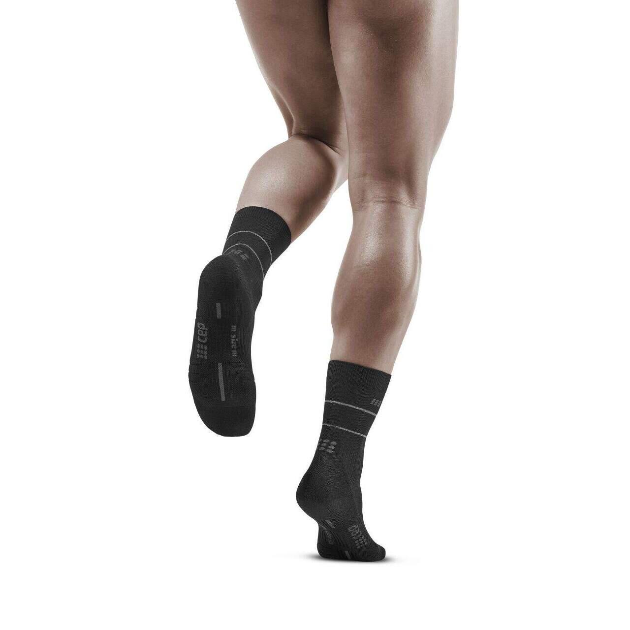Simply put: with the Reflective Compression Mid Cut Socks from CEP, you get the comfort of short running socks without giving up innovative features. SMART REFLECTIVE technology gives you more safety when running at night, while the socks' compressive effect stabilizes your feet and gives you more energy. And thanks to their high-quality design, you can run long distances with virtually no risk of blisters.Innovative reflective design for better visibilityWith the Reflective Compression Mid Cut Socks for men, you're even safer when running at dusk or at night, thanks to the reflective thread stripes. They guarantee optimal 360° visibility in all situations. Less blisters thanks to the interaction of material and shapeWhen socks rub against the foot during long-distance running, blisters can occur. With Reflective Compression Mid Cut Socks, this risk is reduced. This is made possible by the combination of breathable and flexible materials with a close-fitting shape that minimizes friction and thus reduces the likelihood of blisters forming.Greater stability to reduce the risk of injuryThe compressive effect of these men's running socks gives you more energy, making your legs noticeably lighter. But that's not all: the compression also stimulates your ankles in depth, which improves their stability. This reduces the risk of injury, and therefore of missing training sessions. Run at night as well as during the day and enjoy the extra security of the innovative Reflective Compression Mid Cut Socks during your training sessions!
