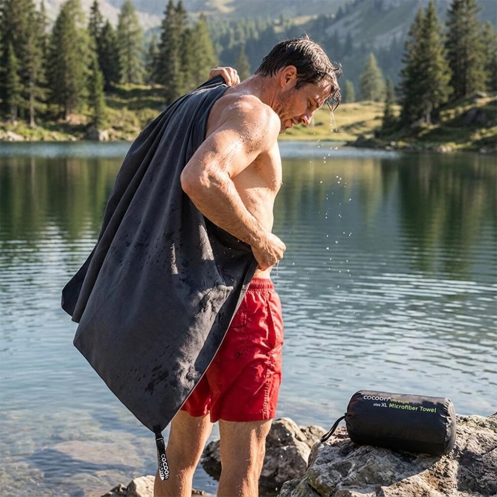 Whether you are embarking on a multi-day trek through the mountains, backpacking across continents, or enjoying a minimalist camping trip close to home, space and weight are always crucial factors. The Cocoon Hyperlight X-Large is specifically designed for adventurers who refuse to compromise between comfort and efficiency. This towel takes up barely any space in your luggage, leaving more room for other essential gear. The feeling of a fresh dip in a mountain lake or a quick shower in a hostel becomes even more enjoyable knowing your drying gear won't weigh you down as a wet, heavy lump in your bag. The fabric feels soft against the skin and, despite its extremely light weight, offers the comfort of a full-sized bath towel.