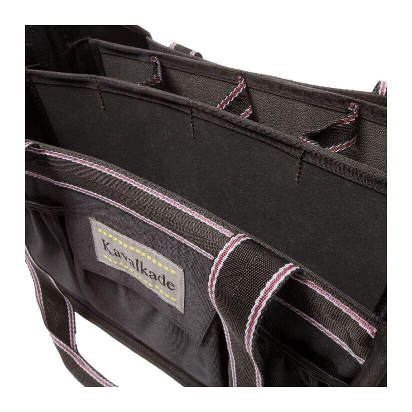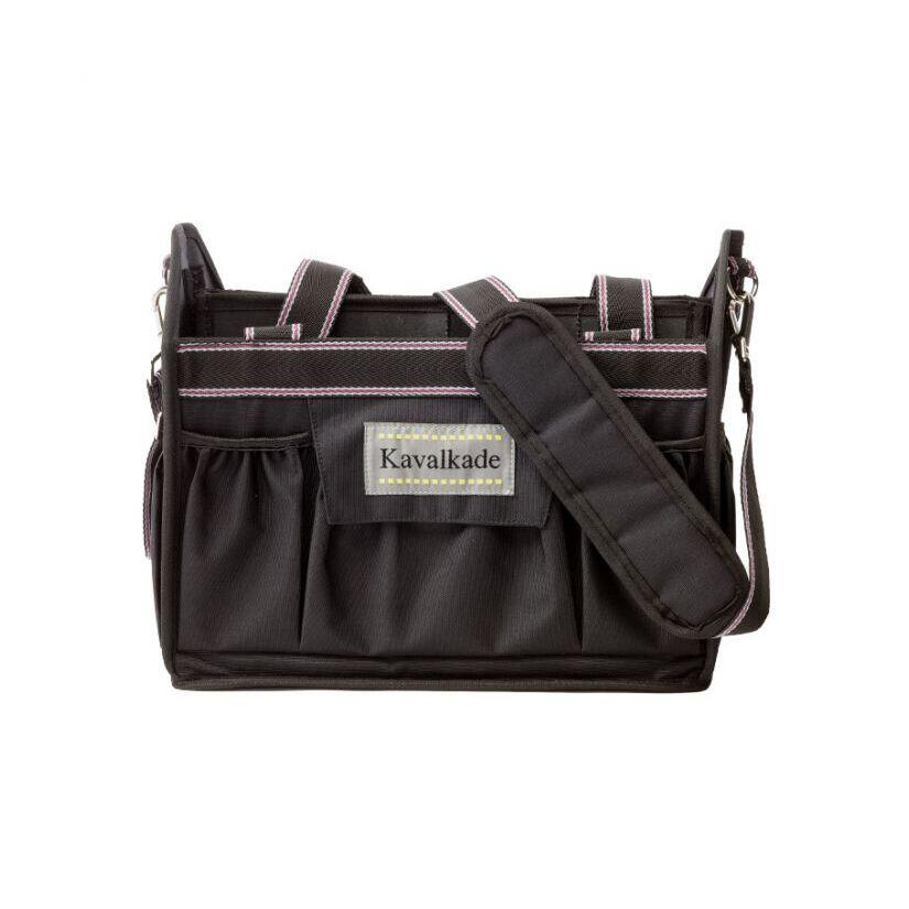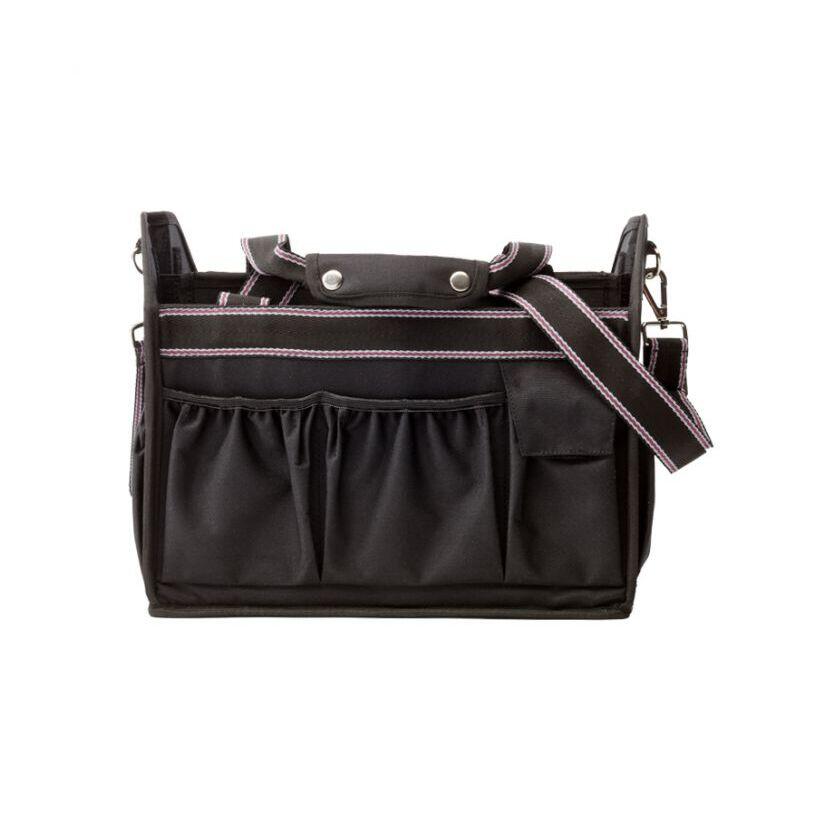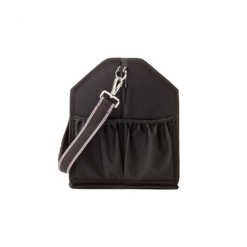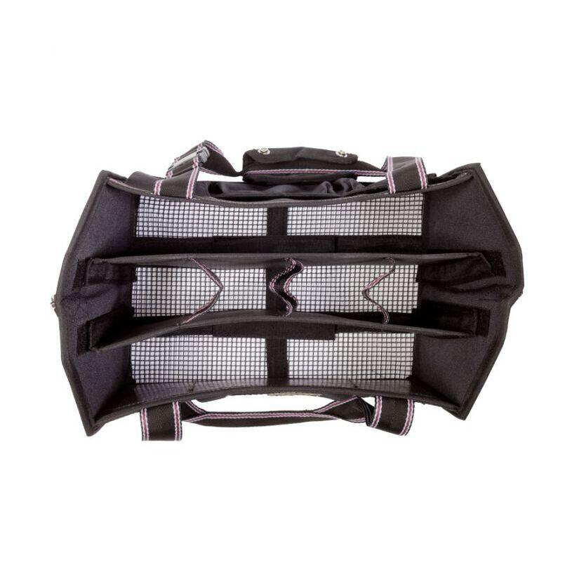 Trendy cleaning bagThe practical stable or competition aid is ideal for cleaning products, bandages or care products. In order not to lose small items, the bag has a total of nine outer compartments of different sizes, two of which can be closed with Velcro. The bag can be carried either by short handles or by a long detachable shoulder handle. The bottom is made of a sturdy mesh material, so that dirt and hair inside the bag do not stand a chance. The inner walls are easy to clean and washable. Foldable for optimal storage. cleaning bag- nine exterior compartments- three large interior compartments- two short and one long removable handles in navy-pink-white- interior walls are washable- bottom is made of mesh material so dirt and horse hair don't stay in your pocket- foldableFor more informationColor: black/gray-black-bordeaux, navy/navy-brown-beige, burgundy/bordeaux-rosaMaterial: 100% PolyesterSize: (HxBxT) 30 x 36 x 30 cm