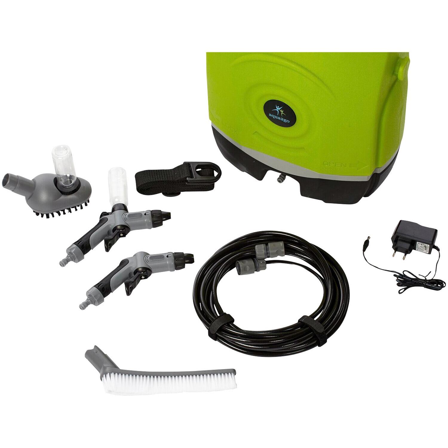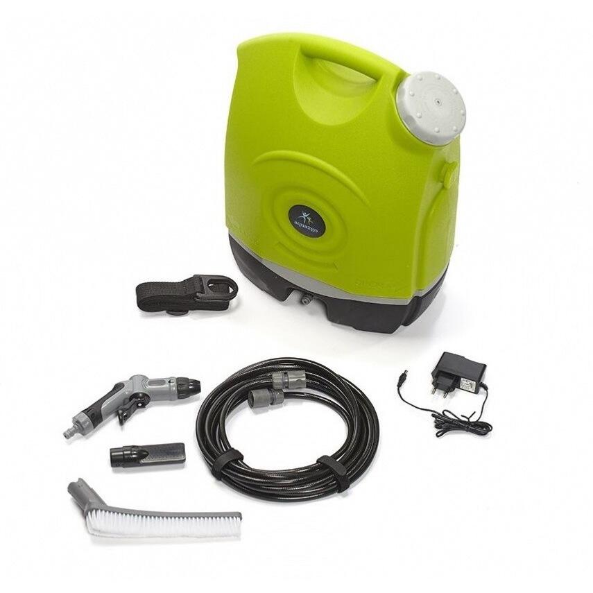Met de aqua2go mobil accu-drukreiniger GD73 reinig je je fiets overal waar je maar bent – je hebt geen stroom- of wateraansluiting nodig! De slechts ca. 4 kg lichte en compacte drukreiniger heeft een waterreservoir met een volume van ca. 17 liter waarmee je je fiets tot wel 30 minuten lang zonder onderbreking kunt reinigen. De krachtige lithium-ion-accu levert genoeg power om zelfs hardnekkig vuil te verwijderen. Optimaal dus voor de dringende reiniging na een modderige MTB-trail. En is de accu leeg? Dan kun je het apparaat aansluiten op de sigarettenaansteker van je auto zodat je hem kunt blijven gebruiken. De van 3 tot 9 bar regelbare waterdruk en de lange, lakbeschermende borstel zorgen ervoor dat je fiets glanst als nooit tevoren. De reiniger staat zeer stevig op de grond. Details: • lichte en mobiele accu-drukreiniger – ideaal voor het reinigen van je bike onderweg • ruimtebesparend, compact design • lithium-ion-accu, oplaadbaar met 220 volt, 2,2 Ah (een acculading is voldoende voor tot 5 reservoirvullingen) • gebruik ook mogelijk via de stekkeraansluiting in de auto (12 volt-aansluitkabel in de onderzijde van het apparaat geïntegreerd, geen laadfunctie) • 17 liter waterreservoir voor ca. 30 minuten continue gebruik (afneembaar) • waterdruk: 3 tot 9 bar, instelbaar • instelbare sproeiposities • lakbeschermende borstel die op de slang kan worden geplaatst • slanglengte: ca. 6 m • staat stevig op de grond • afmetingen: ca. H 45 cm/B 36 cm/D 20 cm • materiaal: kunststof • totaal gewicht: ca. 4 kg De levering omvat: aqua2go mobil accu-drukreiniger met 17 liter waterreservoir • 6 m hogedrukslang • sproeikop • douchekop • lange borstel • 220 volt stekker met kabel • 12 volt-kabel voor in de sigarettenaansteker (geïntegreerd in het apparaat)