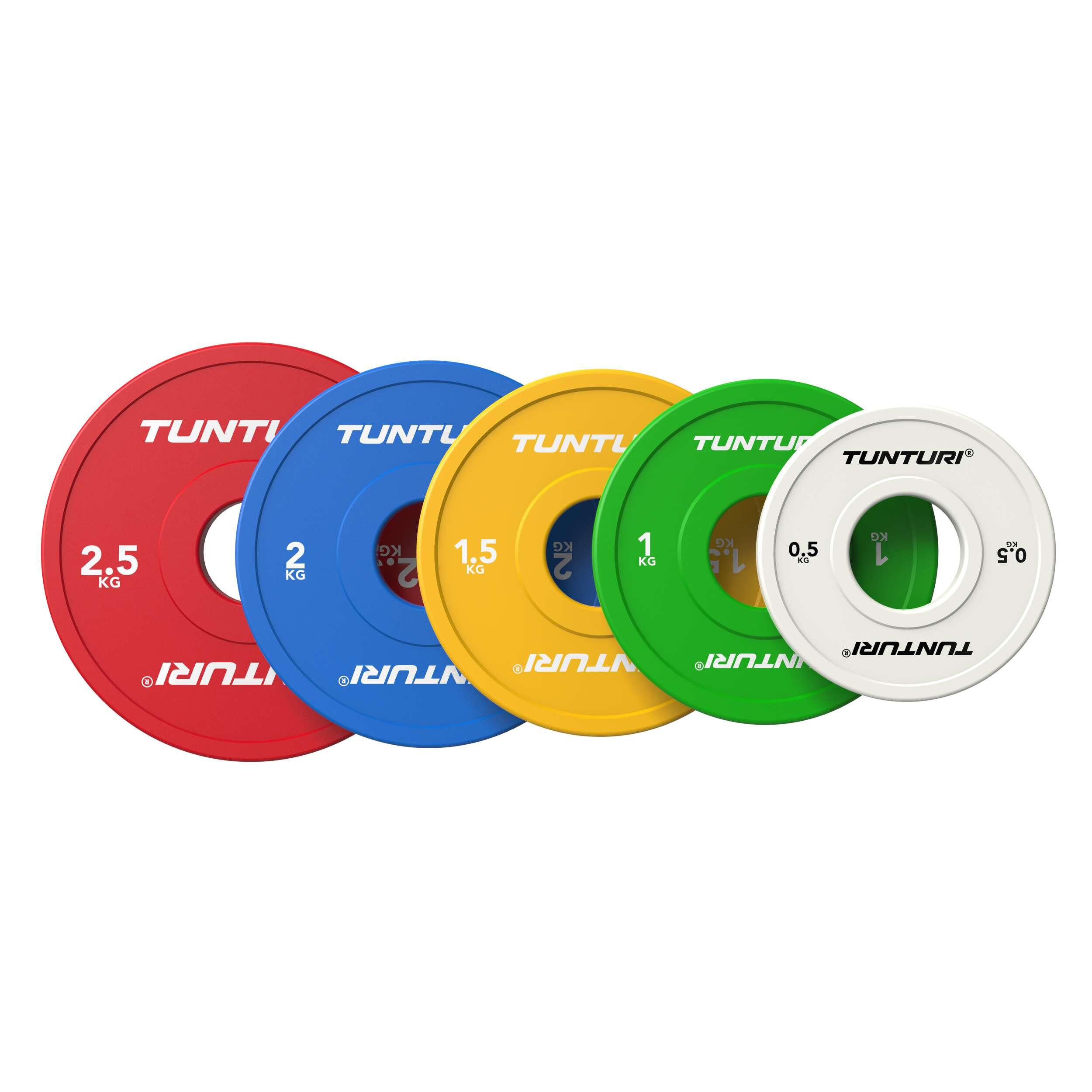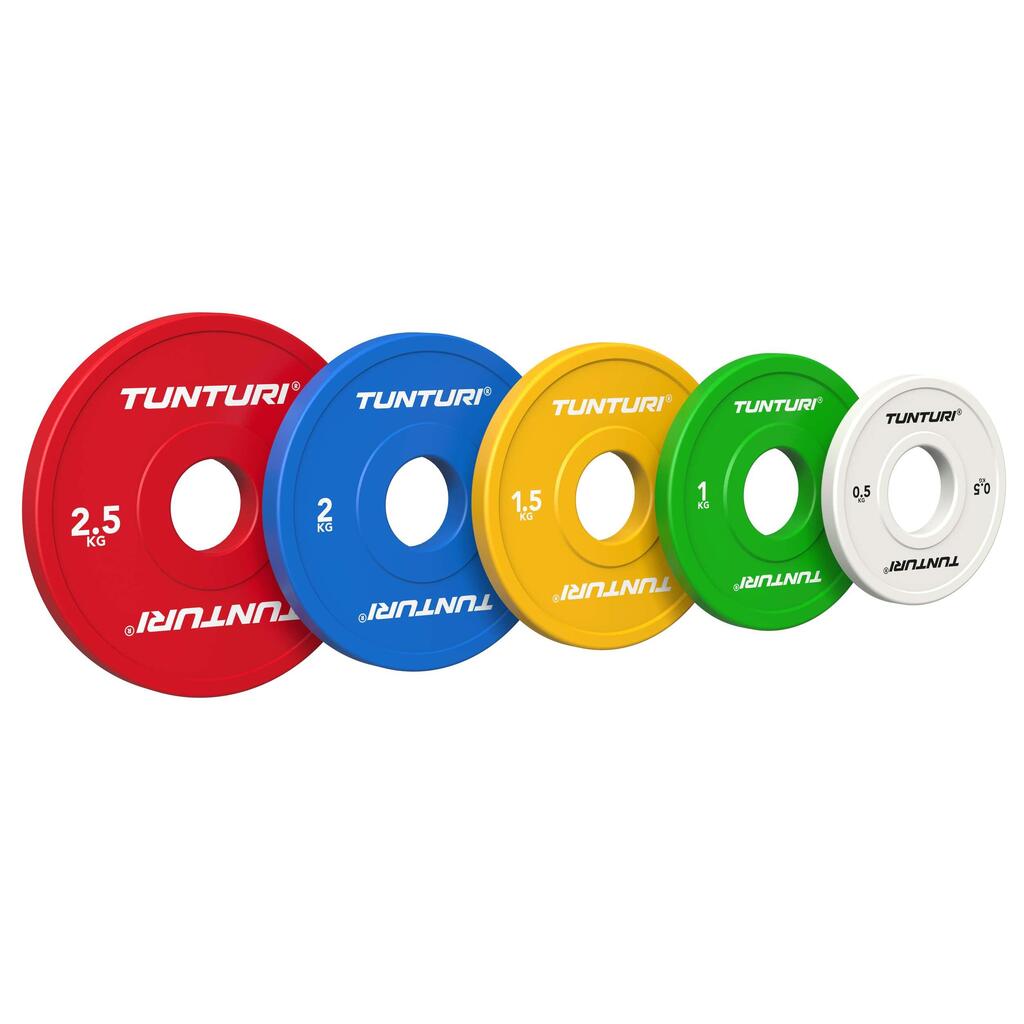 The Tunturi Platinum Fractional Plates range from 0.5 to 2.5 kg and are also available as a complete 15 kg set. Thanks to the colour coding, you can quickly switch weights and maintain an organised training flow.