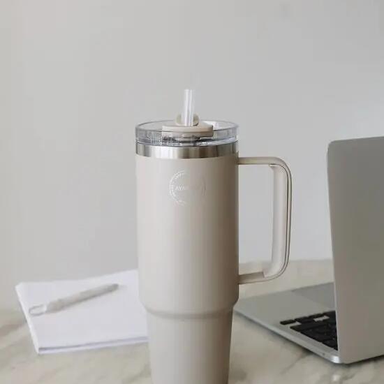Stylish 885 ml thermocup with straw – perfect for both cold and hot drinks on the go.