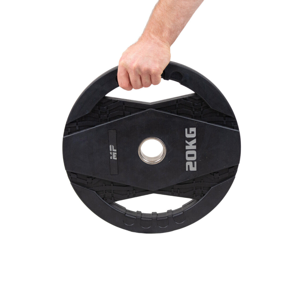 Rubber Olympic Weight Plates with handles are suitable for Olympic 50 mm barbells and have a hole diameter of 51 mm.