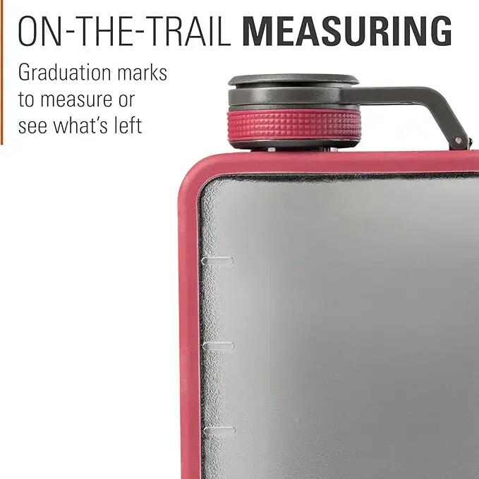 Durable flask with silicone sleeve and transparent window – perfect for hiking, travel, or campfires.