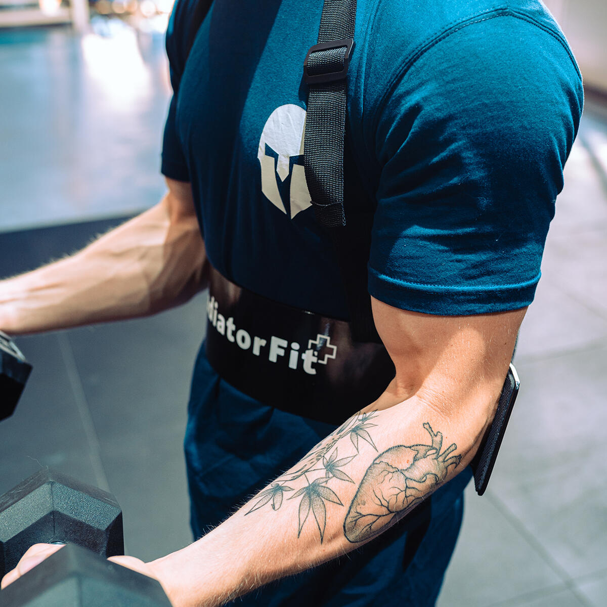 The reinforced steel GladiatorFit arm blaster immobilizes your elbows and stabilizes your shoulders for perfectly isolated bicep and tricep curls, without cheating or straining your back.