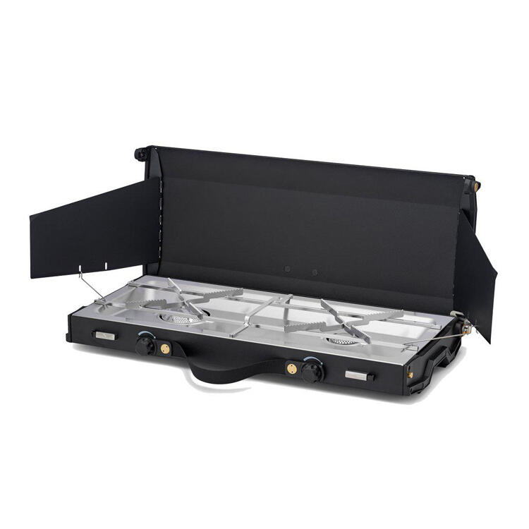 The Alika stove boasts two distinct burner sizes, offering a range of flame options for simultaneous cooking at various temperatures. Its removable lid facilitates 360? cooking, fostering interaction and connection among fellow campers, and the lid, featuring oak laths, doubles as a convenient hotplate for resting cookware.