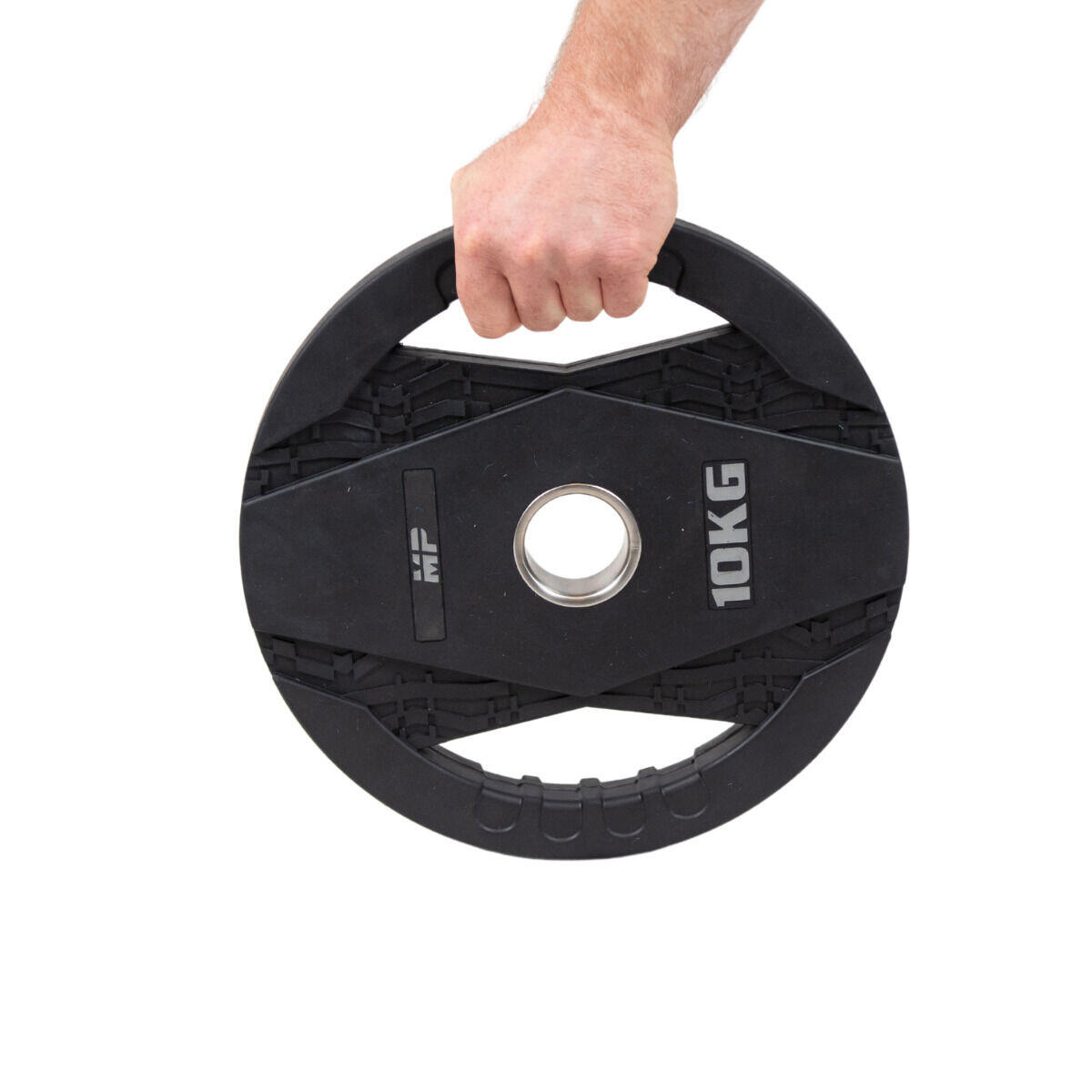 Rubber Olympic Weight Plates with handles are suitable for Olympic 50 mm barbells and have a hole diameter of 51 mm.