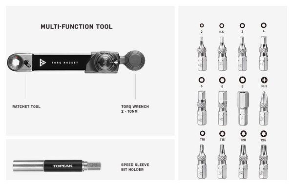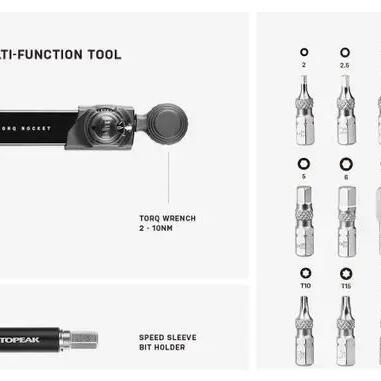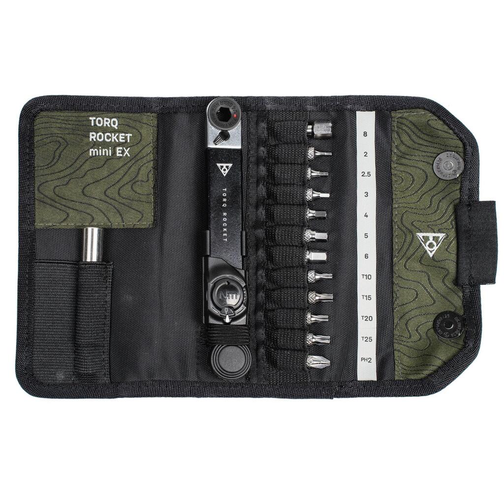 This compact, easy-to-use torque wrench correctly tightens chassis and component bolts to recommended torque values for safety and performance. It features a reversible ratchet head with standard hex drive for fast rotation and control in tight spaces. This compact, multi-function torque wrench set packs down into a compact package that's small enough to carry in a jersey pocket and ready for trail-side repairs or maintenance.Details Torque wrench from 2 to 10 Nm (Tolerance: +/- 15%). Tightening and fine-tuning are carried out using the torque control knob. Depending on the position of the handle, it can also be used as a conventional ratchet tool. Includes 12 bits. Allens: 2 - 2.5 - 3 - 4 - 5 - 6 - 8. Torcx: T10 - T15 - T20 - T25. Philips #2. Speed Sleeve bit holder (70mm). Reversible ratchet head. Tool material: Aluminium / Tempered steel / Engineering plastic. Bag material: 420D / 1000D. Dimensions open: 21.5 x 14.5 cm. Dimensions closed: 14.5 x 7 x 3 cm Weight: 227 g (tools + bag) - 75 g (key). Reference : TT2622