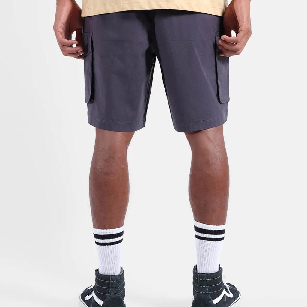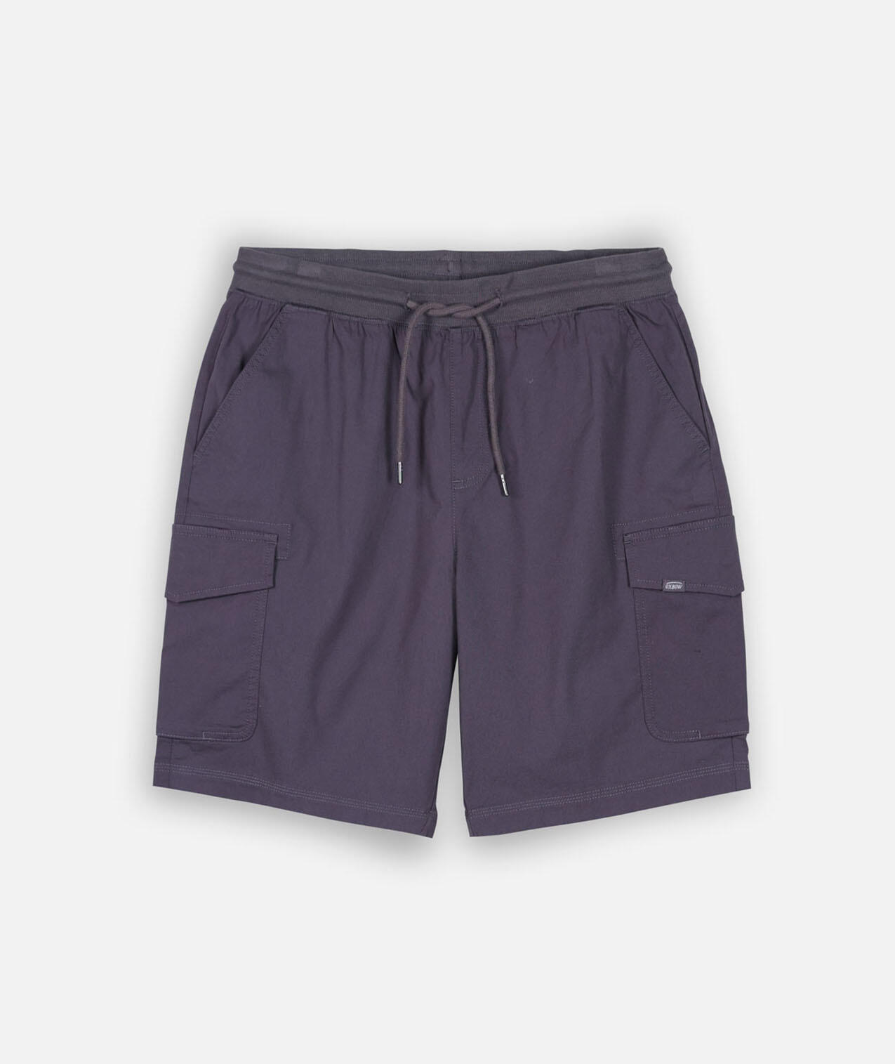 Stretch cargo shorts, ribbed elastic waistband with drawstring, faux fly, side pockets and two back pockets, buttoned cargo pockets, length 20''/52cm