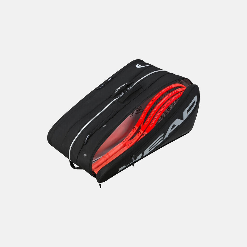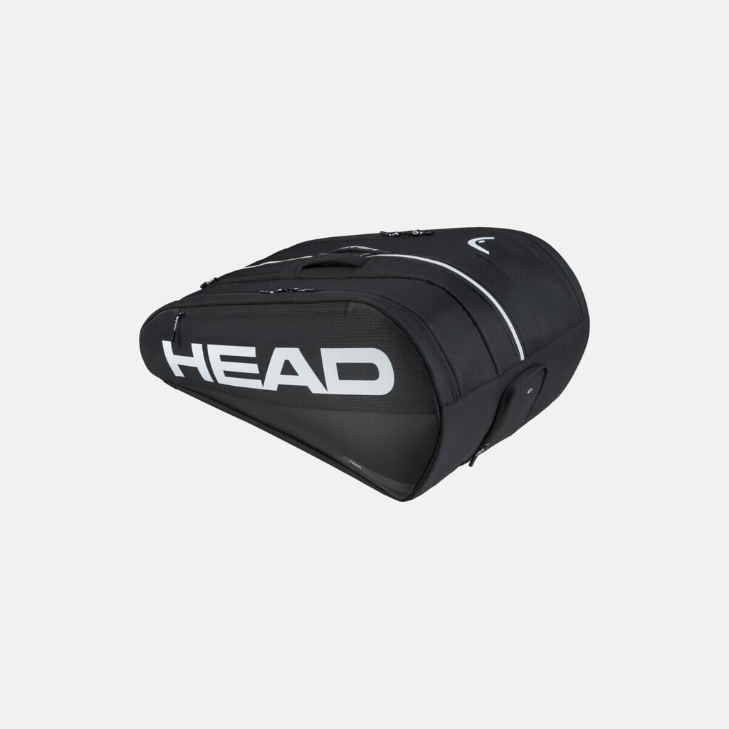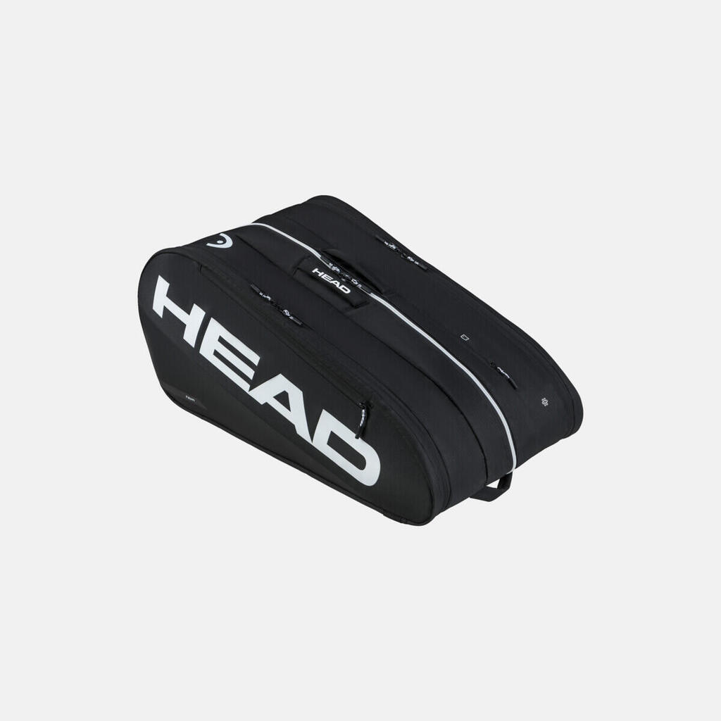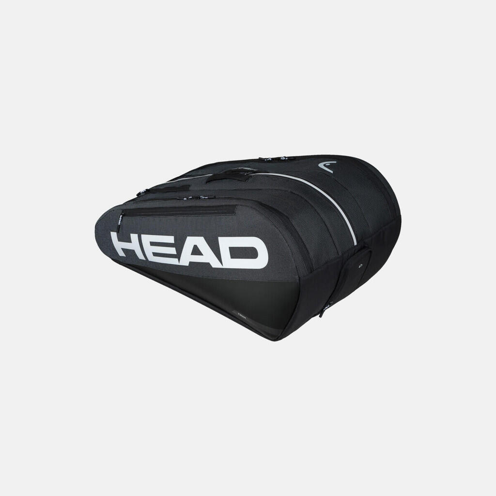 Updated with a new reflective fabric, along with new external pockets, the TOUR RACQUET BAG XL BK has space for up to 12 racquets.