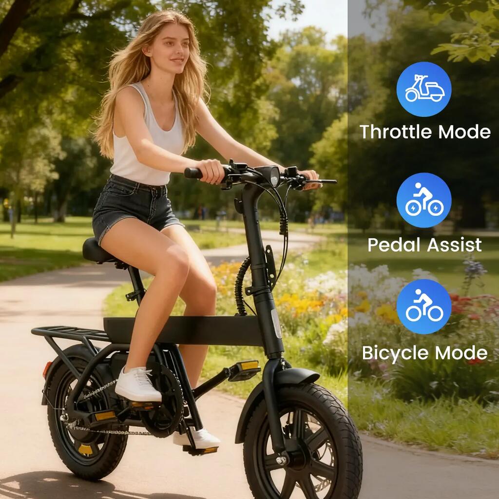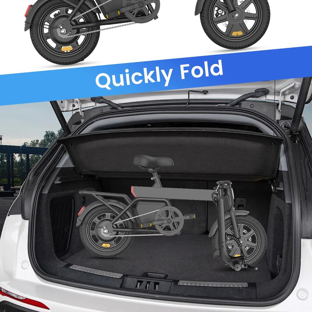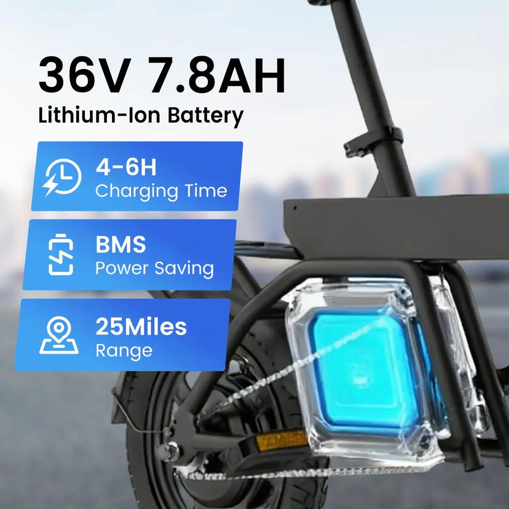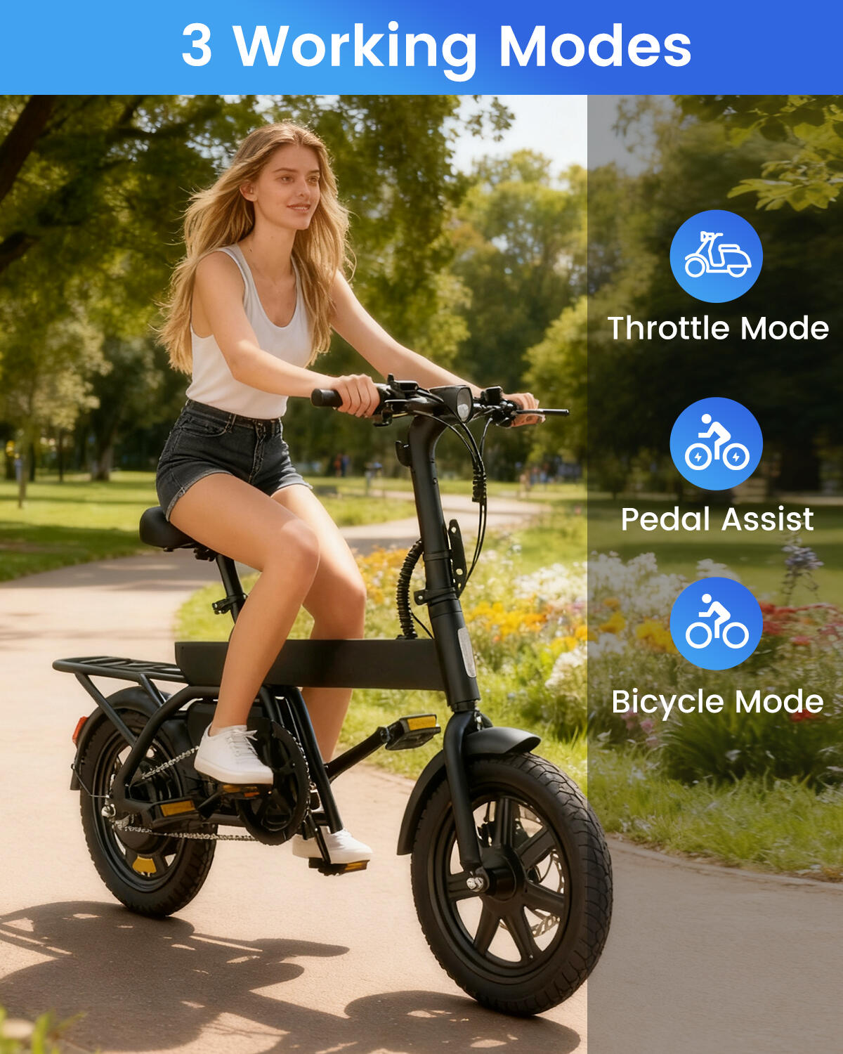 250W brushless motor for reliable power Up to 40km range on a single charge Compact 14-inch tires for agile handling Dual disc brakes for safe braking