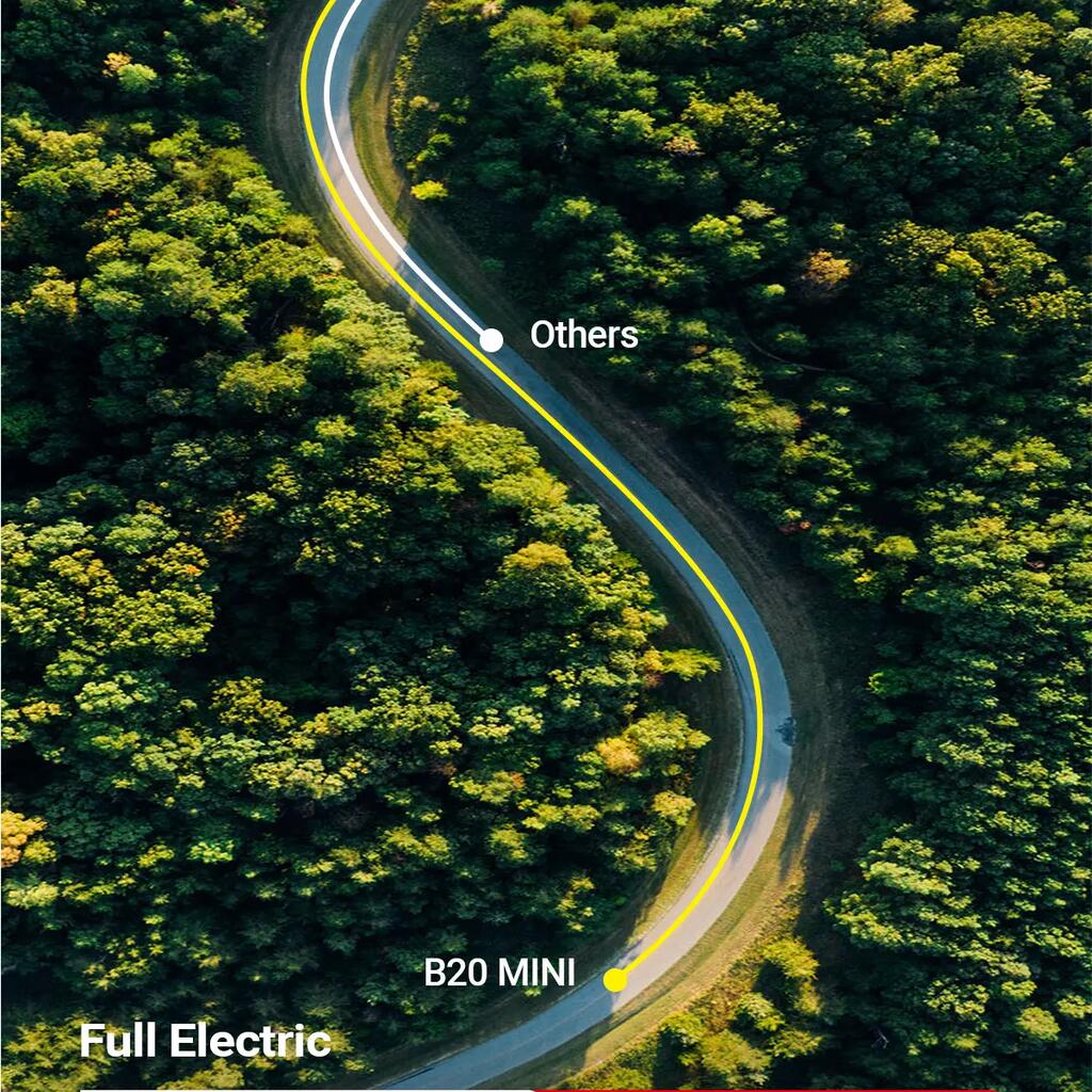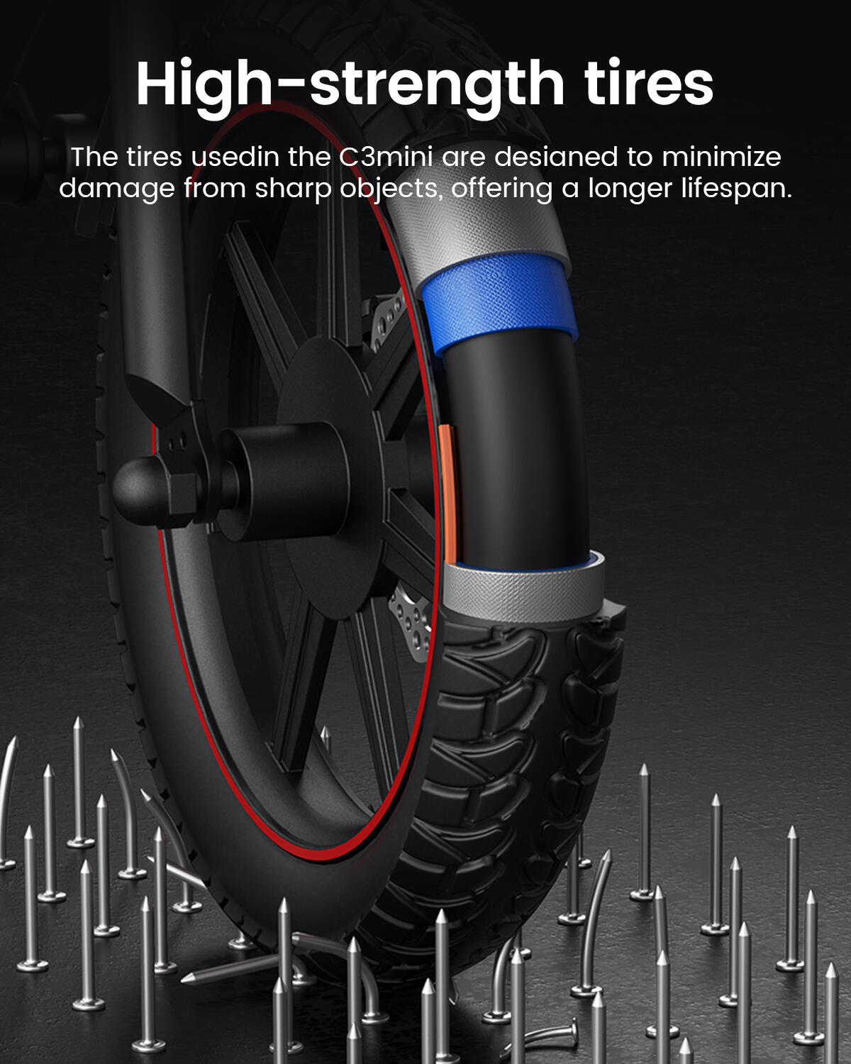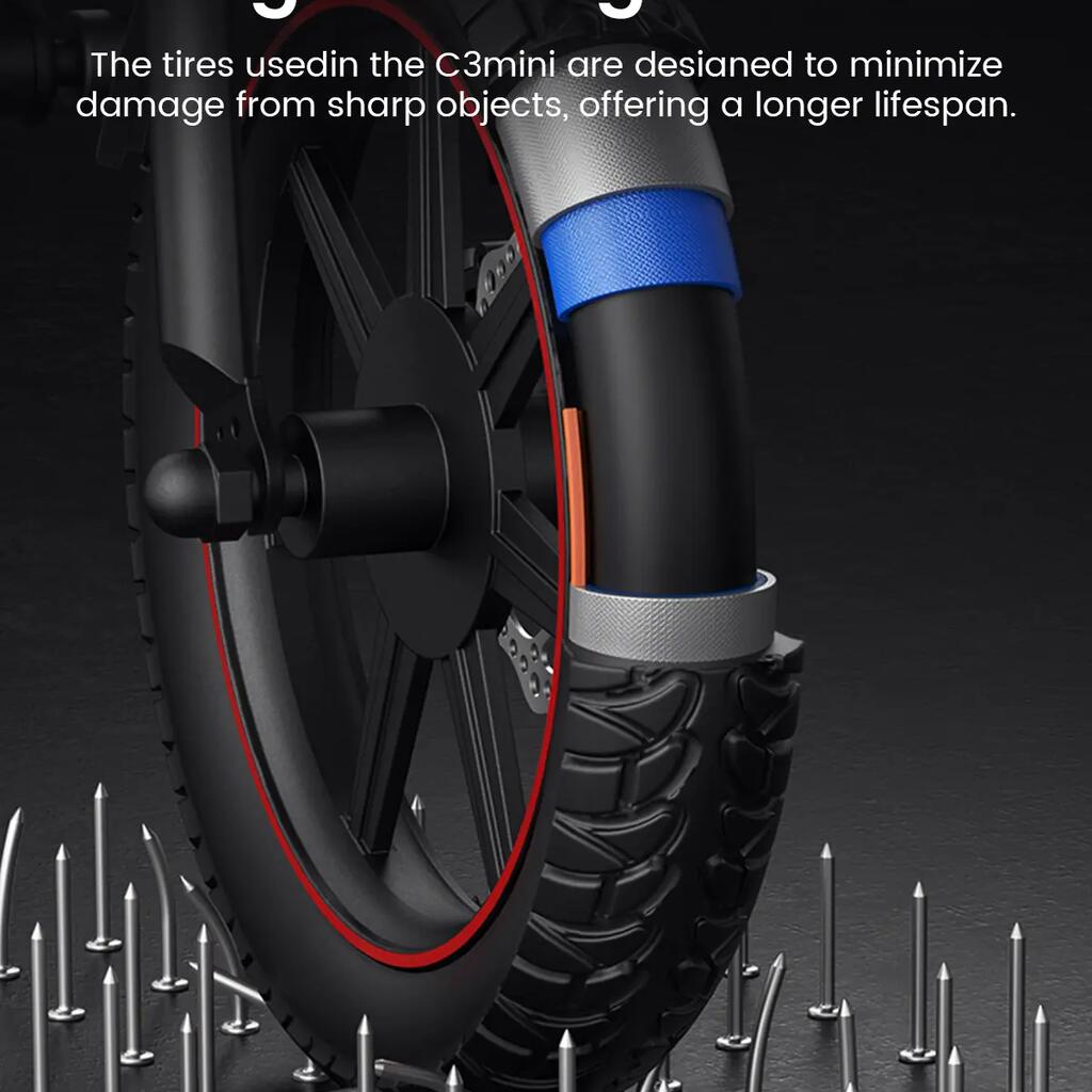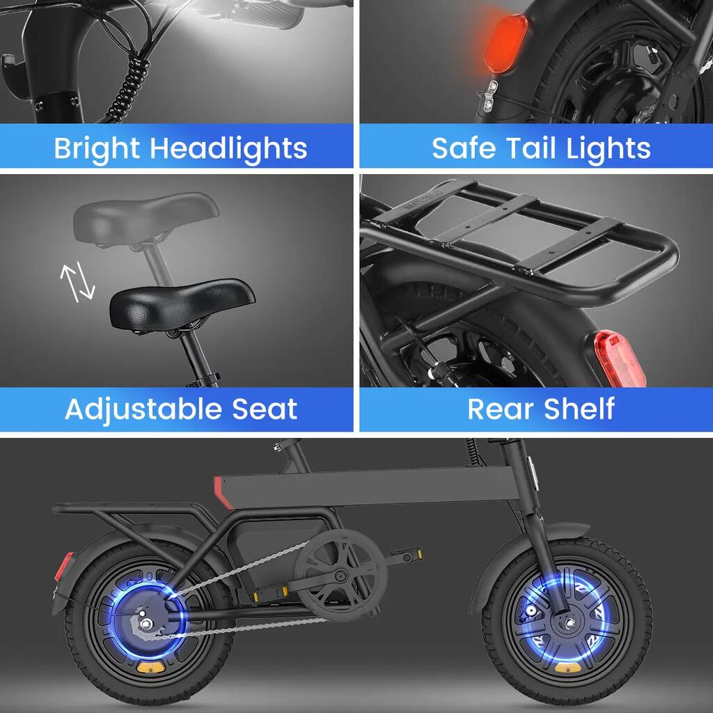 250W brushless motor for reliable power Up to 40km range on a single charge Compact 14-inch tires for agile handling Dual disc brakes for safe braking