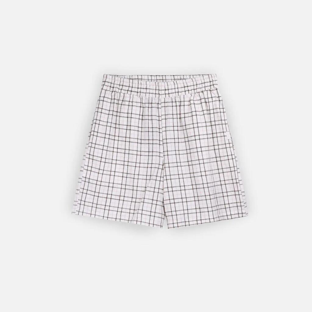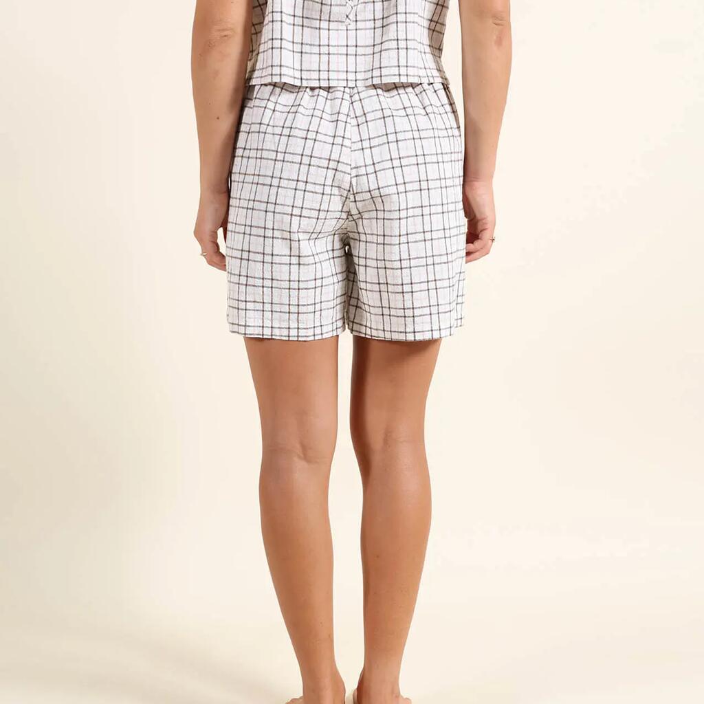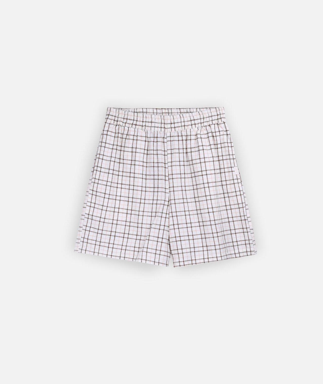 Elastic cotton and linen shorts with check and dyed yarn pattern.
