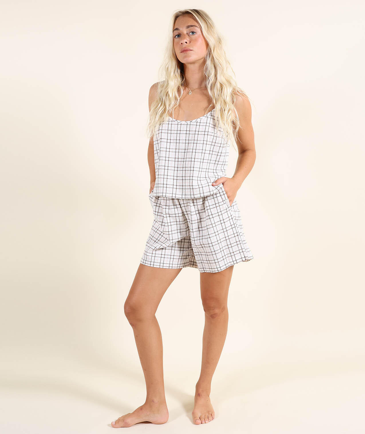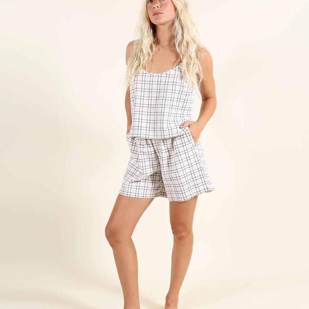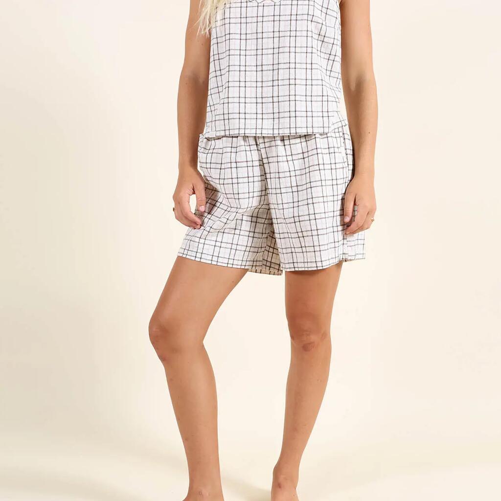 Elastic cotton and linen shorts with check and dyed yarn pattern.