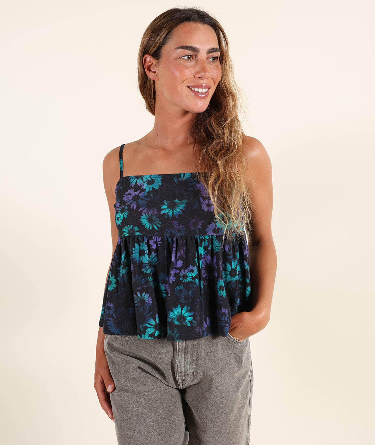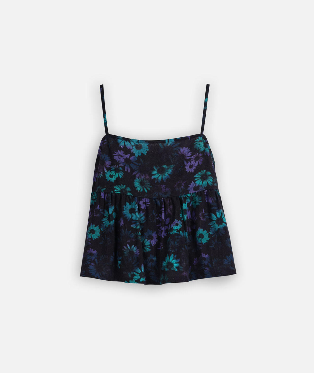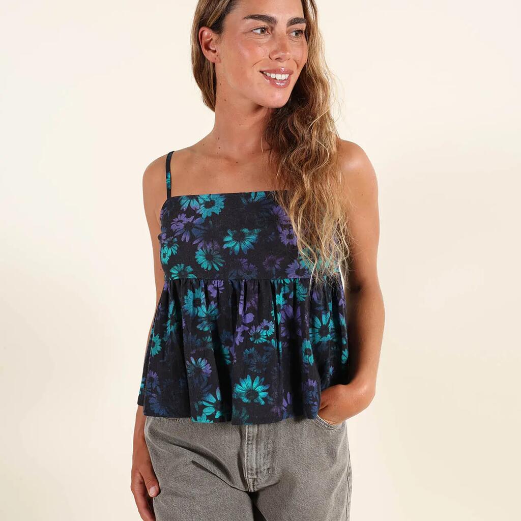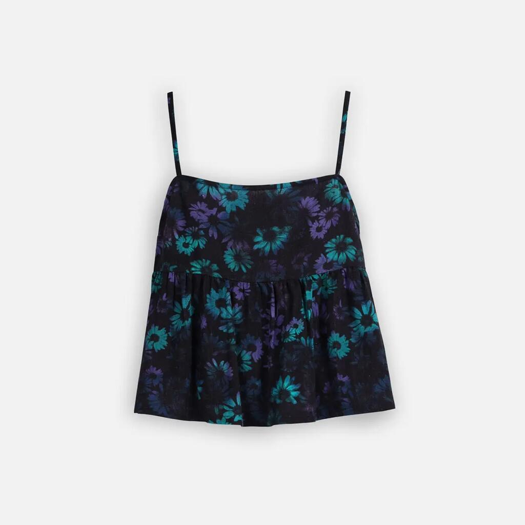 Printed viscose/linen top, thin adjustable straps, elasticized back.