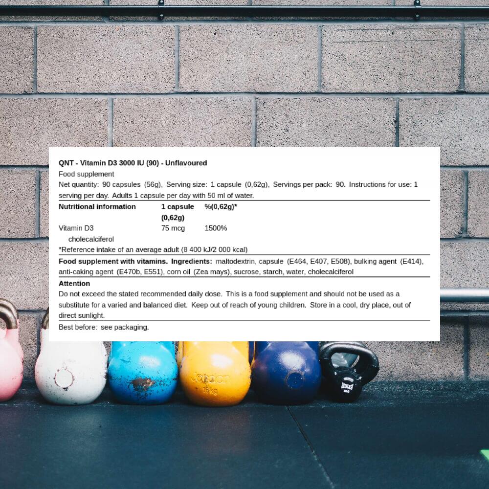 QNT Vitamin D3 3000 IU is suitable for people who are looking for a tasteless, compact supplement that can be easily and flexibly integrated into their everyday lives.**Sports nutrition and supplements:** play an important role in supporting a balanced diet, especially for active people and athletes. They can help to increase performance, promote recovery and provide the necessary energy. Protein products, such as shakes and bars, are particularly popular as they help to build and maintain muscle. In addition to proteins, carbohydrates, vitamins and minerals are also crucial for maintaining physical health and performance. Supplements can be a useful addition to cover specific nutritional needs and ensure that the body is optimally supplied.**Product advantages:** The product Vitamin D3 offers a variety of benefits that make it an ideal choice for health-conscious consumers and athletes: The product is Supplement in compact tablet form; per 100 g free of energy, fat, carbohydrates, and protein. A serving of 0.62 g contains negligible nutritional values., Neutral in taste and easy to take; composition and sensory properties may vary slightly depending on batch or variant., Practical addition to your daily diet without any health, efficacy, or function-related claims.. **Consumption recommendation:** Take one serving (0.62 g) with sufficient water. Each serving provides only negligible nutritional values. The composition may vary slightly depending on the variant or batch.Instructions for use: 1 serving per day.. Adults 1 capsule per day with 50 ml of water.