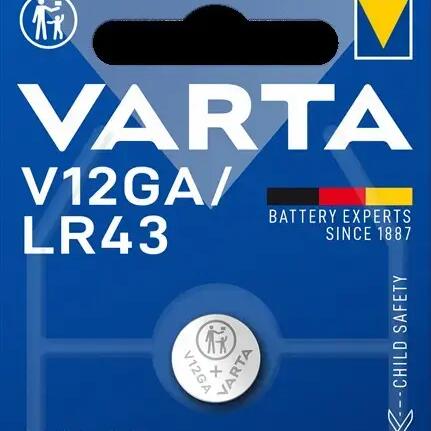 Varta V12GA (LR43) compact alkaline button cell 1.5V 67mAh for small devices.