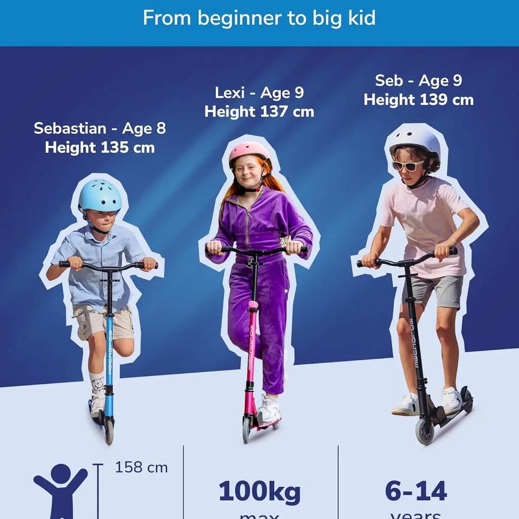 AGE RANGE - Suitable scooter for boys and girls age 6-12 years, with an adjustable handlebar from 72 - 94cm / 28.3 - 37″, weighing up to 100kg / 220lbs that are looking for a durable & lasting 2 wheel big kids scooter because they’re obsessed with scooting or for the school run!