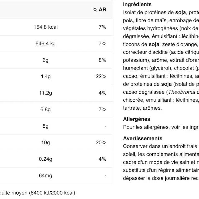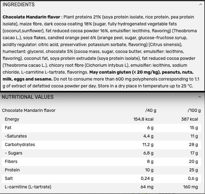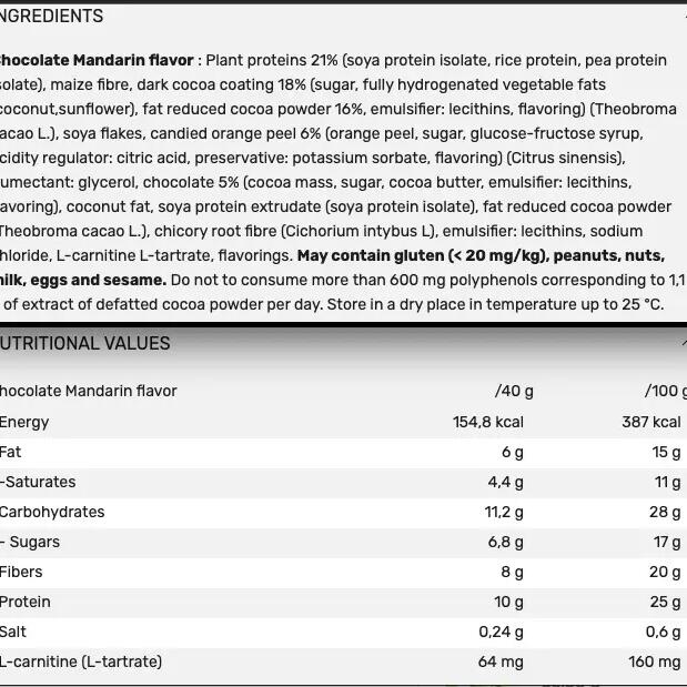 Plant proteins 21% (soya protein isolate, rice protein, pea protein isolate), maize fibre, dark cocoa coating 18% (sugar, fully hydrogenated vegetable fats (coconut,sunflower), fat reduced cocoa powder 16%, emulsifier: lecithins, flavouring) (Theobroma cacao L.), soya flakes, candied orange peel 6% (orange peel, sugar, glucose-fructose syrup, acidity regulator: citric acid, preservative: potassium sorbate, flavouring) (Citrus sinensis), humectant: glycerol, chocolate 5% (cocoa mass, sugar, cocoa butter, emulsifier: lecithins, flavouring), coconut fat, soya protein extrudate (soya protein isolate), fat reduced cocoa powder (Theobroma cacao L.), chicory root fibre (Cichorium intybus L), emulsifier: lecithins, sodium chloride, L-carnitine L-tartrate, flavourings. May contain gluten (< 20 mg/kg), peanuts, nuts, milk, eggs and sesame.