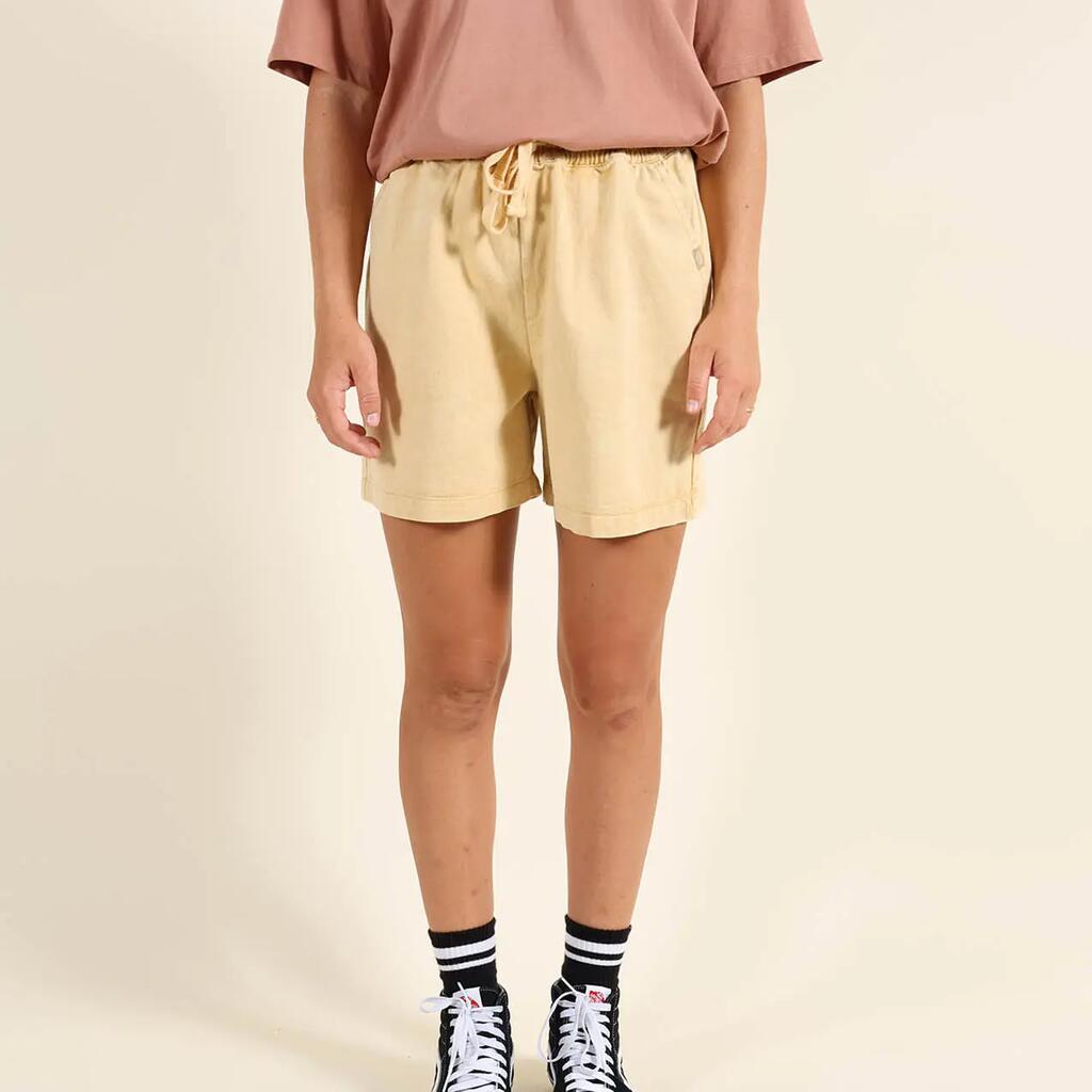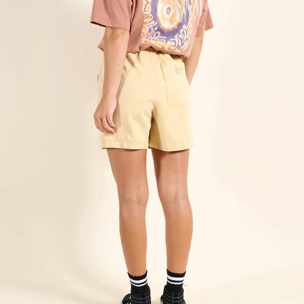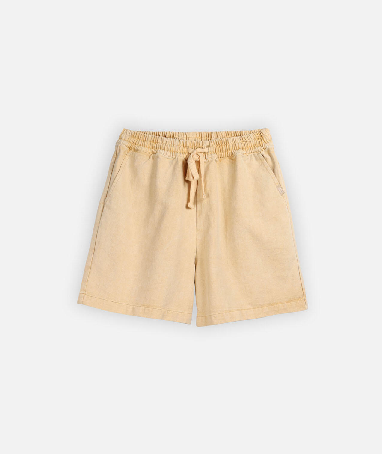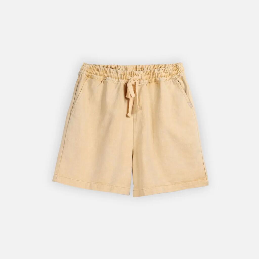 pigment dyed cotton twill shorts, elastic waistband with flat drawstring, back pocket with Oxbow label and label on right leg.