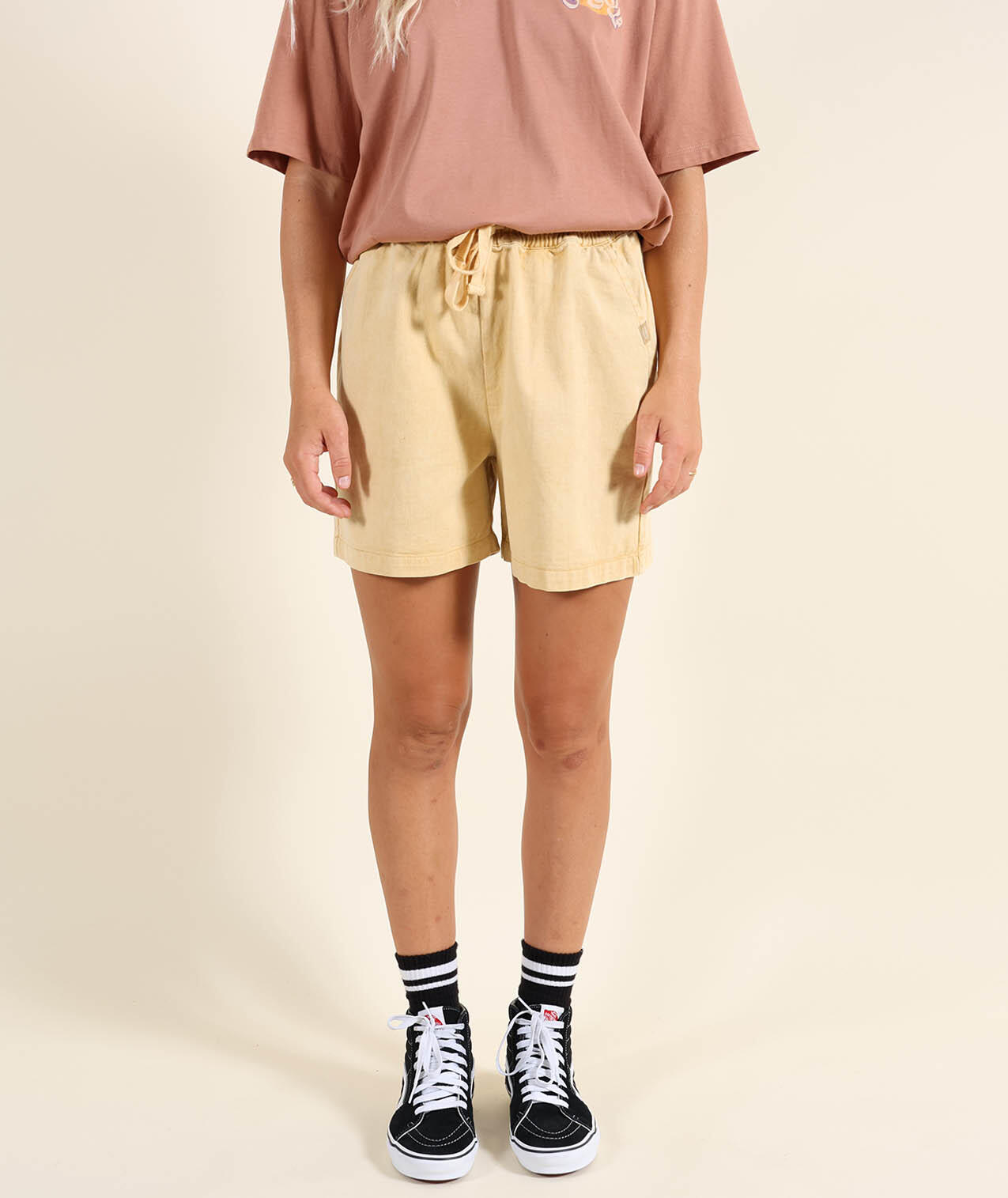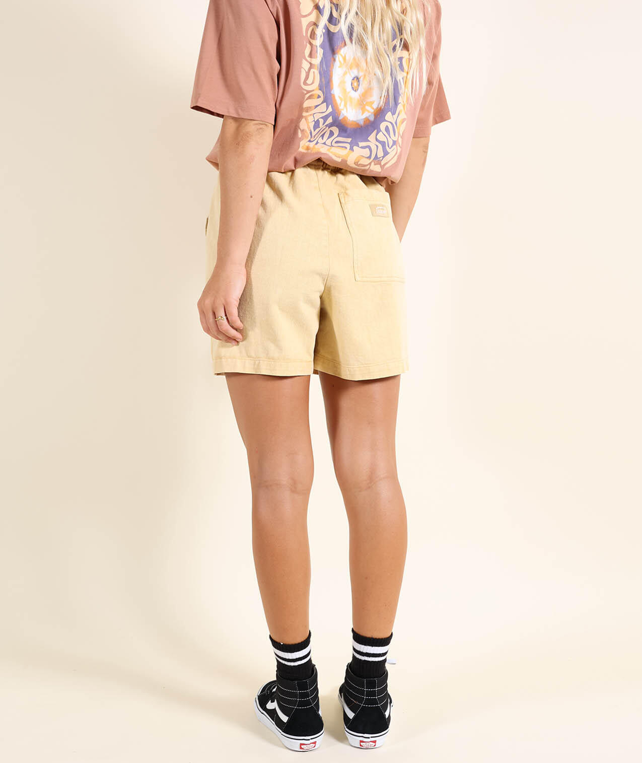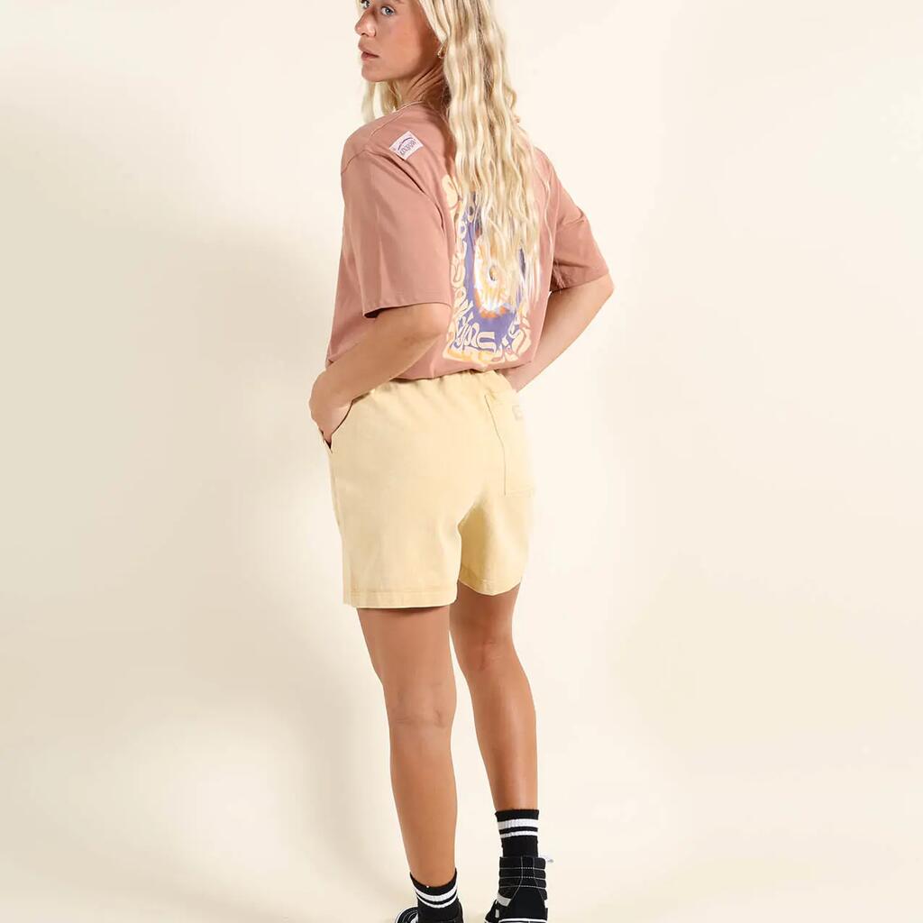 pigment dyed cotton twill shorts, elastic waistband with flat drawstring, back pocket with Oxbow label and label on right leg.