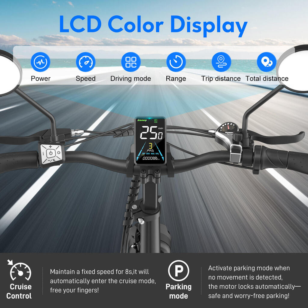 The high-definition LCD display offers a variety of features with easy control, and presets 5 speed levels. The large-screen LCD smart display shows various data such as speed, battery, mileage, and gear. It has a walk assistance mode to help you ride whenever you need.