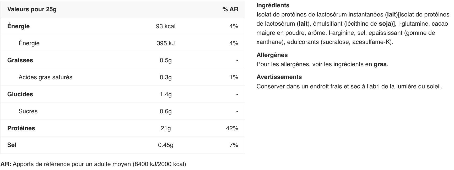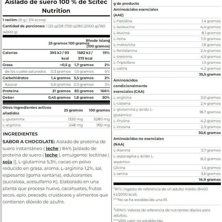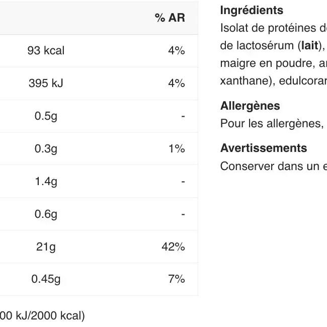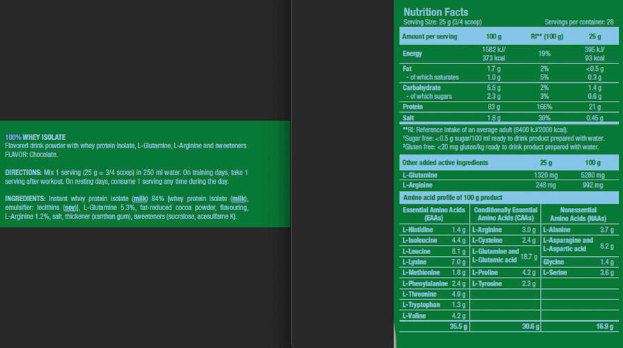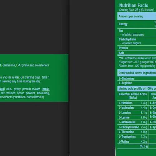 Ingredients Chocolate: Instant whey protein isolate 84% [ Whey protein isolate, emulsifier: lecithins(soya)], L-glutamine 5.3%, defatted cocoa powder, flavouring, L-arginine 1.2%, salt, thickener (xanthan gum), sweeteners (sucralose, acesulfame K). Ingredients Vanilla: Instant whey protein isolate 84% [ Whey protein isolate, emulsifier: lecithin(soya)], flavouring, L-glutamine 5.3%, L-arginine 1.2%, salt, yoghurt powder, thickener (xanthan gum), sweeteners (sucralose, acesulfame K). Ingredients Banana: Instant whey protein isolate 84% [ Whey protein isolate, emulsifier: lecithin(soya)], flavourings, L-glutamine 5.3%, yoghurt powder, L-arginine 1.2%, salt, thickener (xanthan gum), acidifier (malic acid), sweeteners (sucralose, acesulfame K). Ingredients Strawberry: Instant whey protein isolate 85% [ Whey protein isolate, emulsifier: lecithin(soya)], flavourings, L-glutamine 5.3%, L-arginine 1.2%, salt, beet powder concentrate, acidifier (citric acid)], thickener (xanthan gum), sweeteners (sucralose, acesulfame K), acidifier (malic acid). Ingredients Raspberry: Instant whey protein isolate 87% [ Whey protein isolate, emulsifier: lecithin(soya)], L-glutamine 5.3%, flavourings, L-arginine 1.2%, acidifier (malic acid), salt, thickener (xanthan gum), sweeteners (sucralose, acesulfame K), color (Ponceau 4R*).*May have adverse effects on activity and attention in children.Ingredients Pistachio: Instant whey protein isolate 86% [ Whey protein isolate, emulsifier: lecithin(soya)], flavourings, L-glutamine 5.3%, L-arginine 1.2%, salt, thickener (xanthan gum), sweeteners (sucralose, acesulfame K), colourings (ammoniacal caramel, copper complexes of chlorophylls and chlorophyllines, riboflavins).Ingredients Cookies & Cream : Instant whey protein isolate 84% [( whey protein isolate, emulsifier: lecithin(soya)], flavourings, L-glutamine 5.3%, L-arginine 1.2%, salt, thickener (xanthan gum), sweeteners (sucralose, acesulfame K), defatted cocoa powder.Ingredients Salted caramel: Instant whey protein isolate 84% [ Whey protein isolate, emulsifier: lecithins(soya)], L-glutamine 5.3%, flavourings, salt 3.4%, L-arginine 1.2%, thickener (xanthan gum), color (ammoniacal caramel), sweeteners (sucralose, acesulfame K).