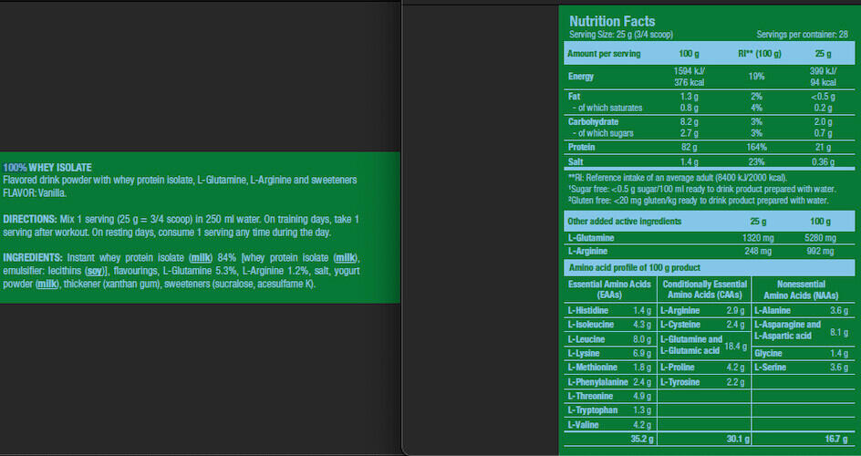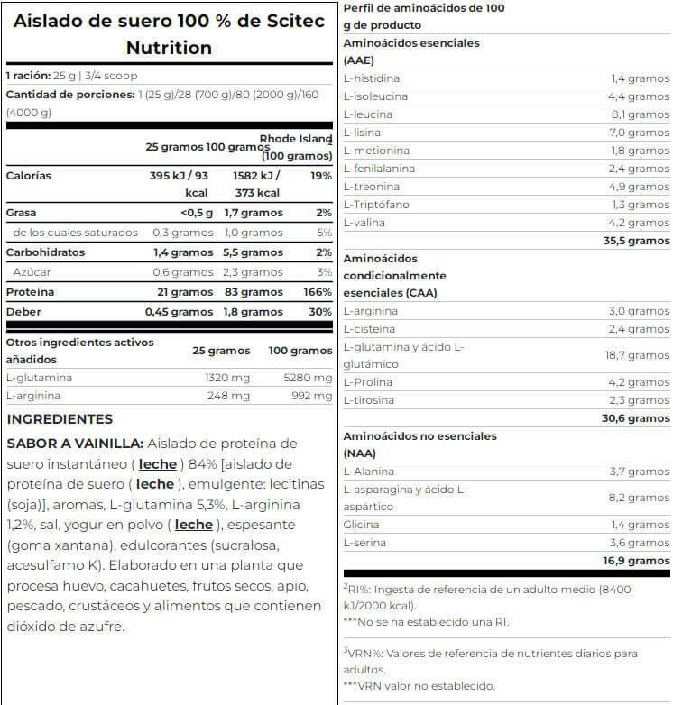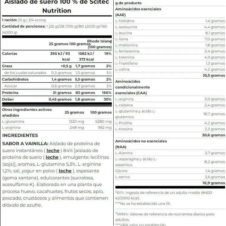 Scitec Nutrition's 100% Whey Isolate is a pure, sugar-free, gluten-free whey protein isolate with added L-glutamine and L-arginine.