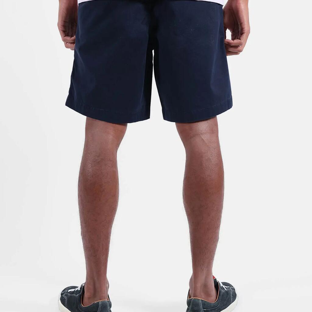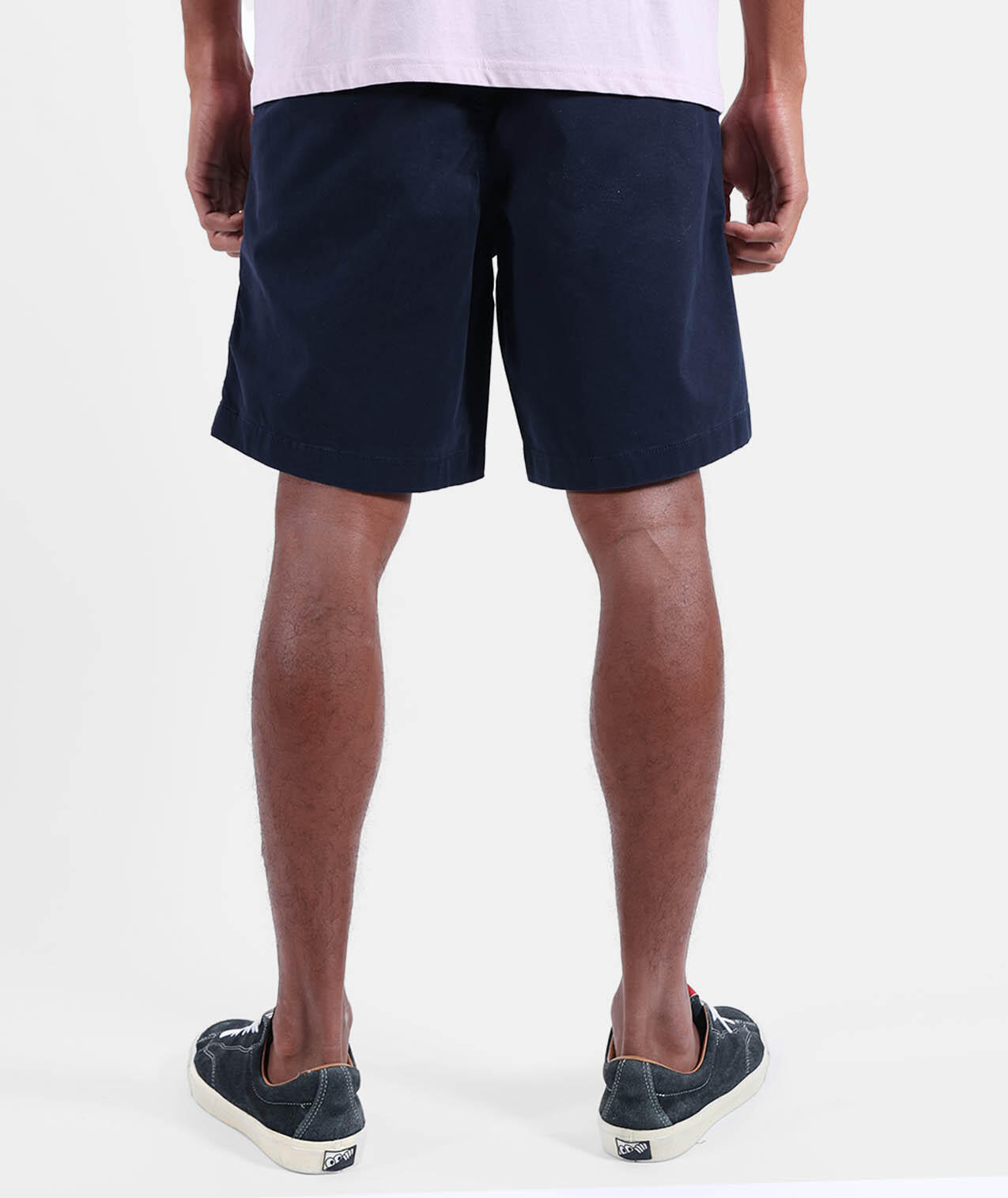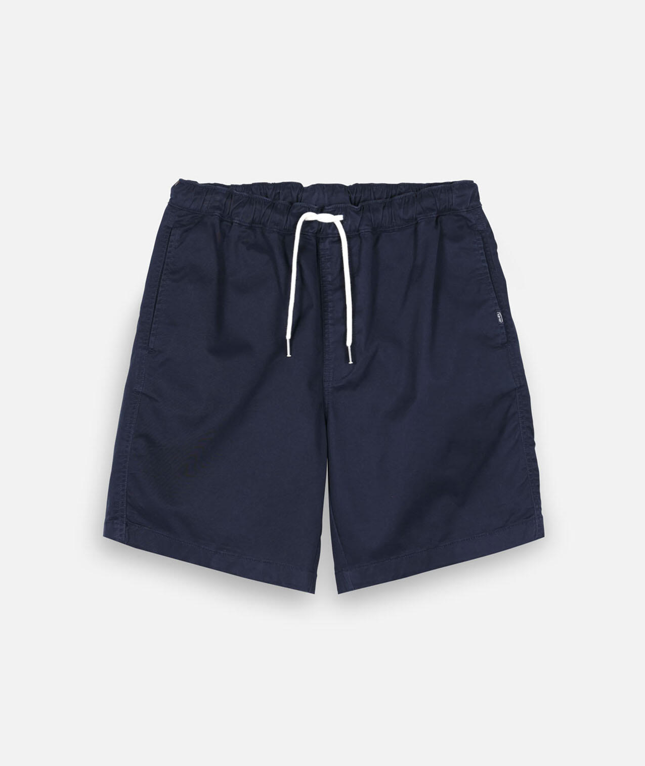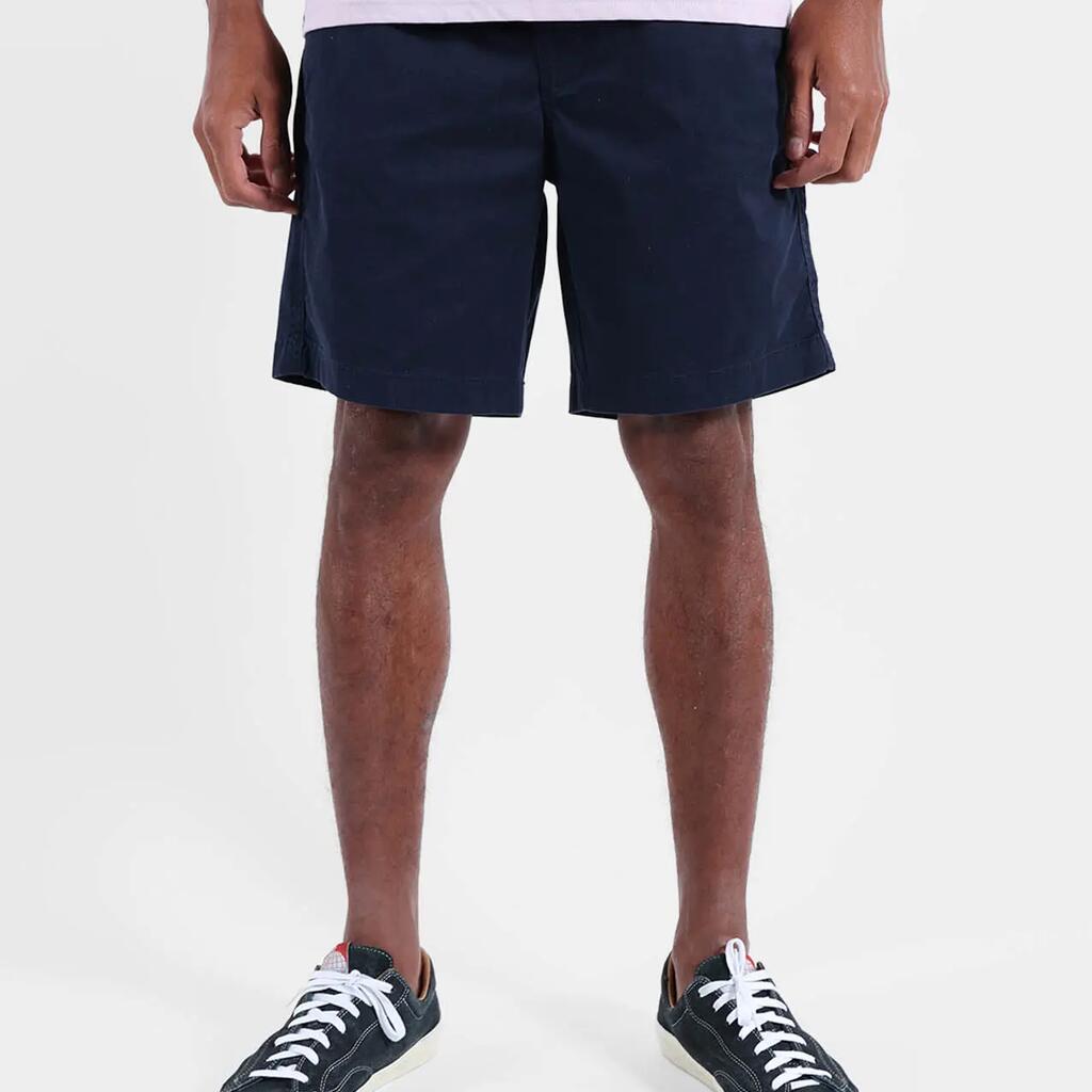 Stretch elastic shorts, elastic waistband with contrast drawstring, printed pocket bags, faux fly, side pockets and two buttoned back pockets, length 19''/49cm