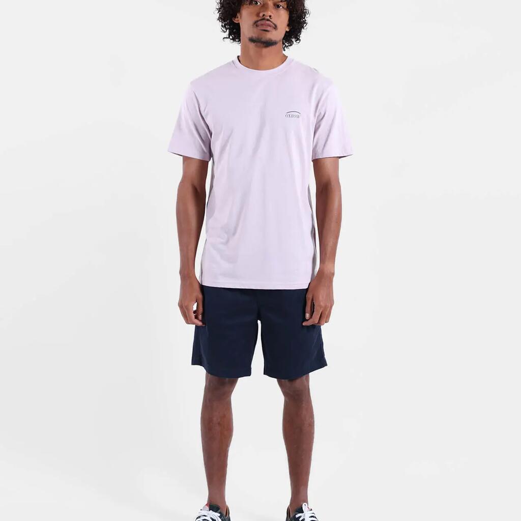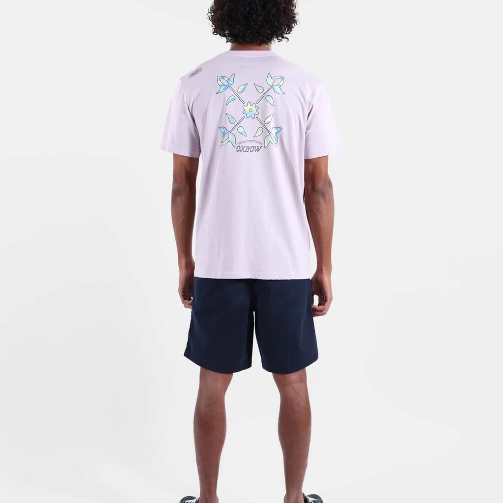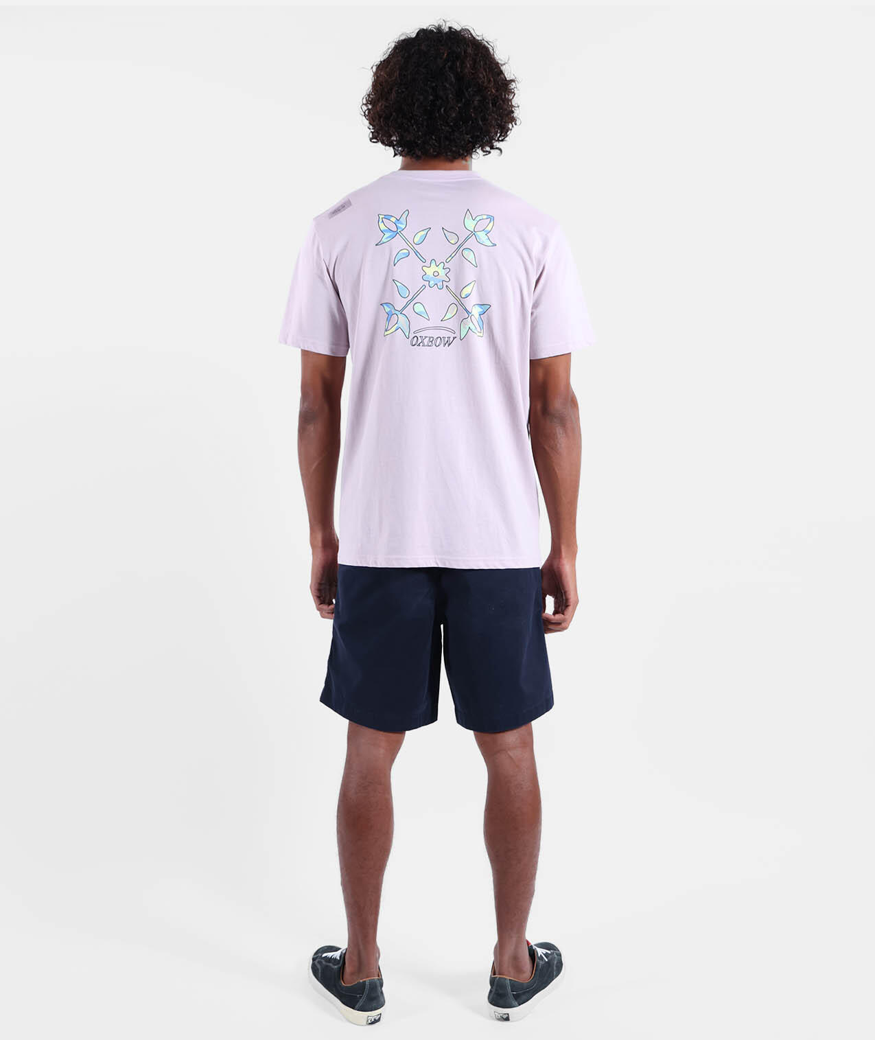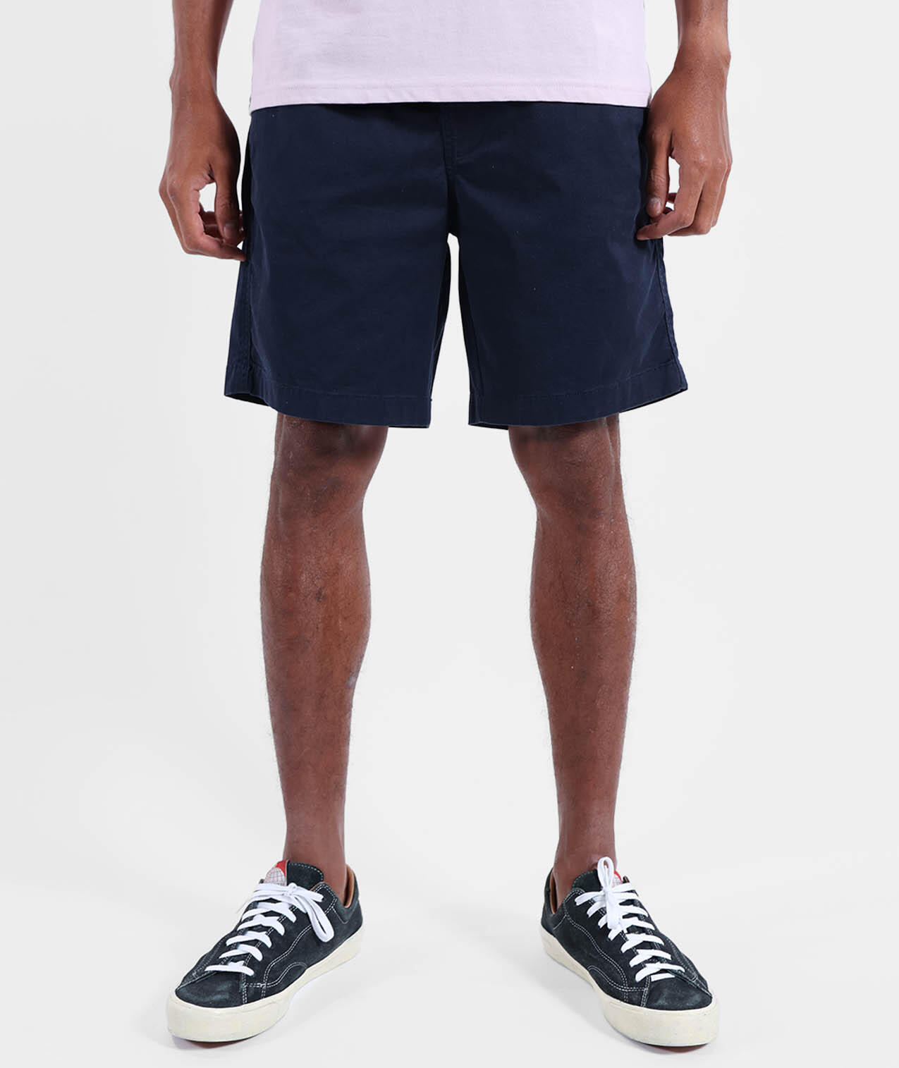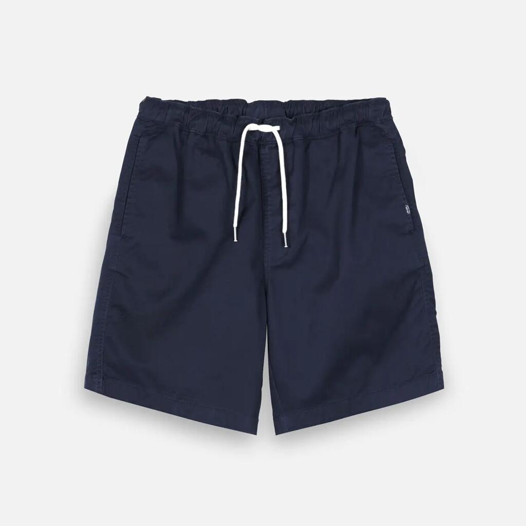Stretch elastic shorts, elastic waistband with contrast drawstring, printed pocket bags, faux fly, side pockets and two buttoned back pockets, length 19''/49cm
