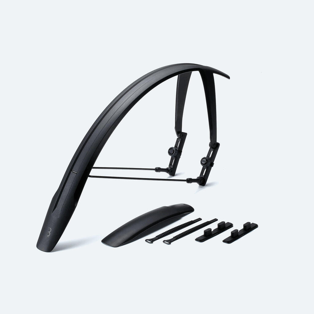 Our mudguards DiscGuard revolutionise mudguards for disc brake bikes. Its quick-fix design offers complete coverage and great protection. This rear mudguard is adjustable in angle and height, ensuring a perfect fit for your bike. The quick-release seat post mounting system allows for easy installation and removal. You can install the mudguard without damaging the frame thanks to the large rubber mounting surface. DiscGuard comes with optional extensions for greater versatility, all made from 75% certified GRS recycled durable and strong PP materials.