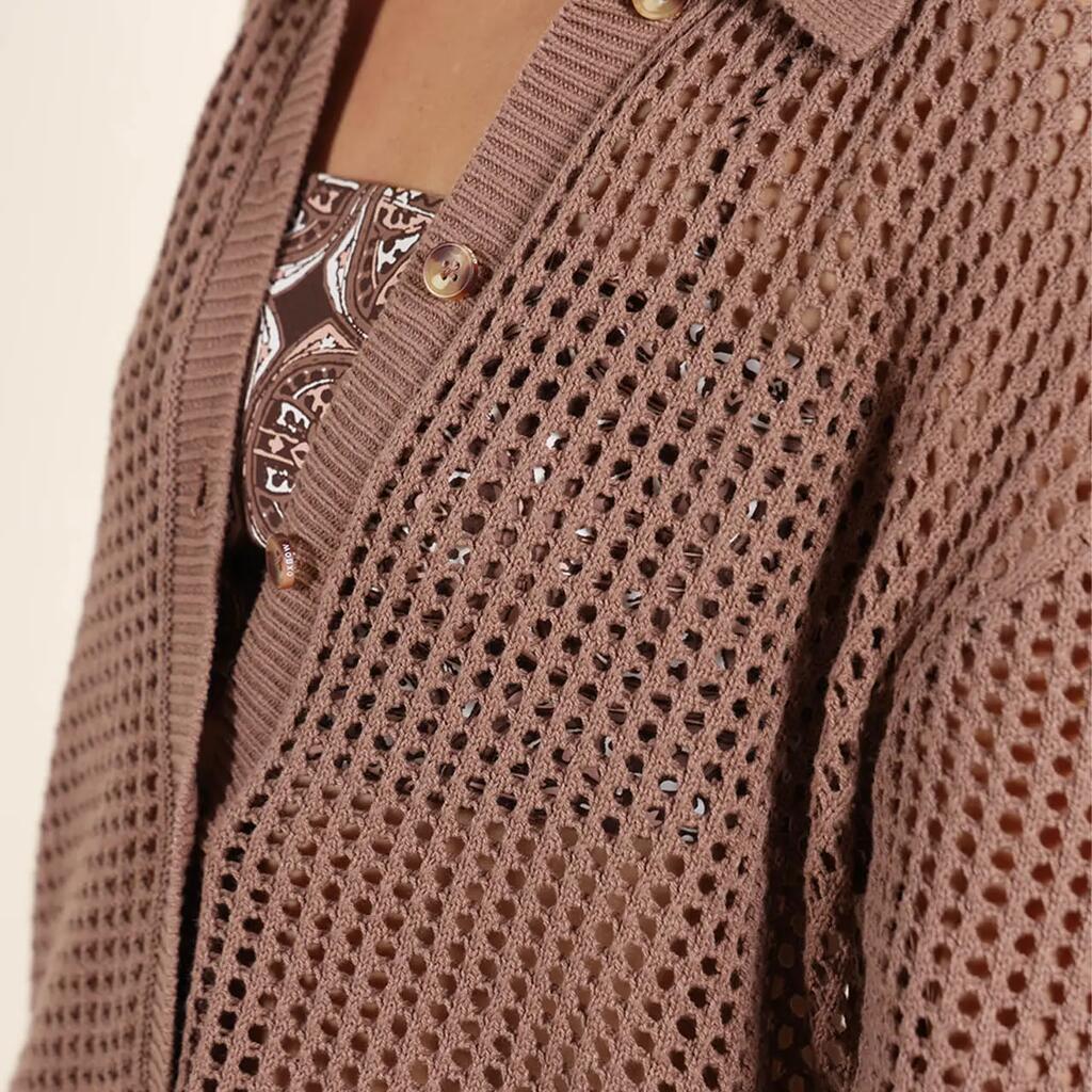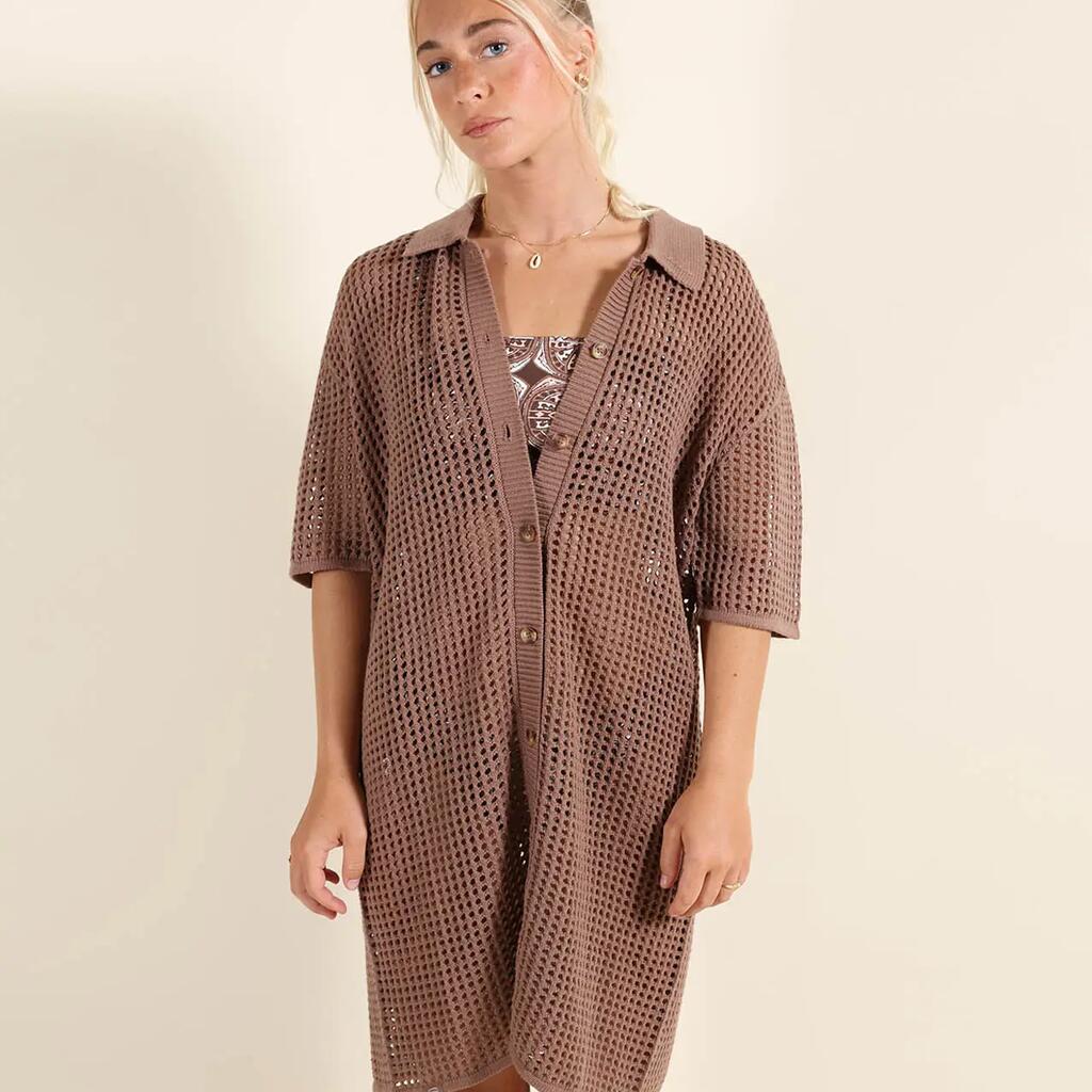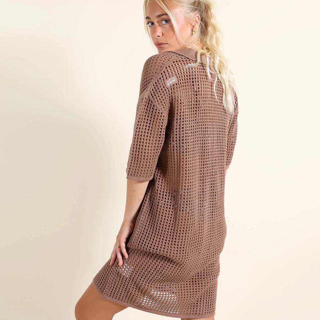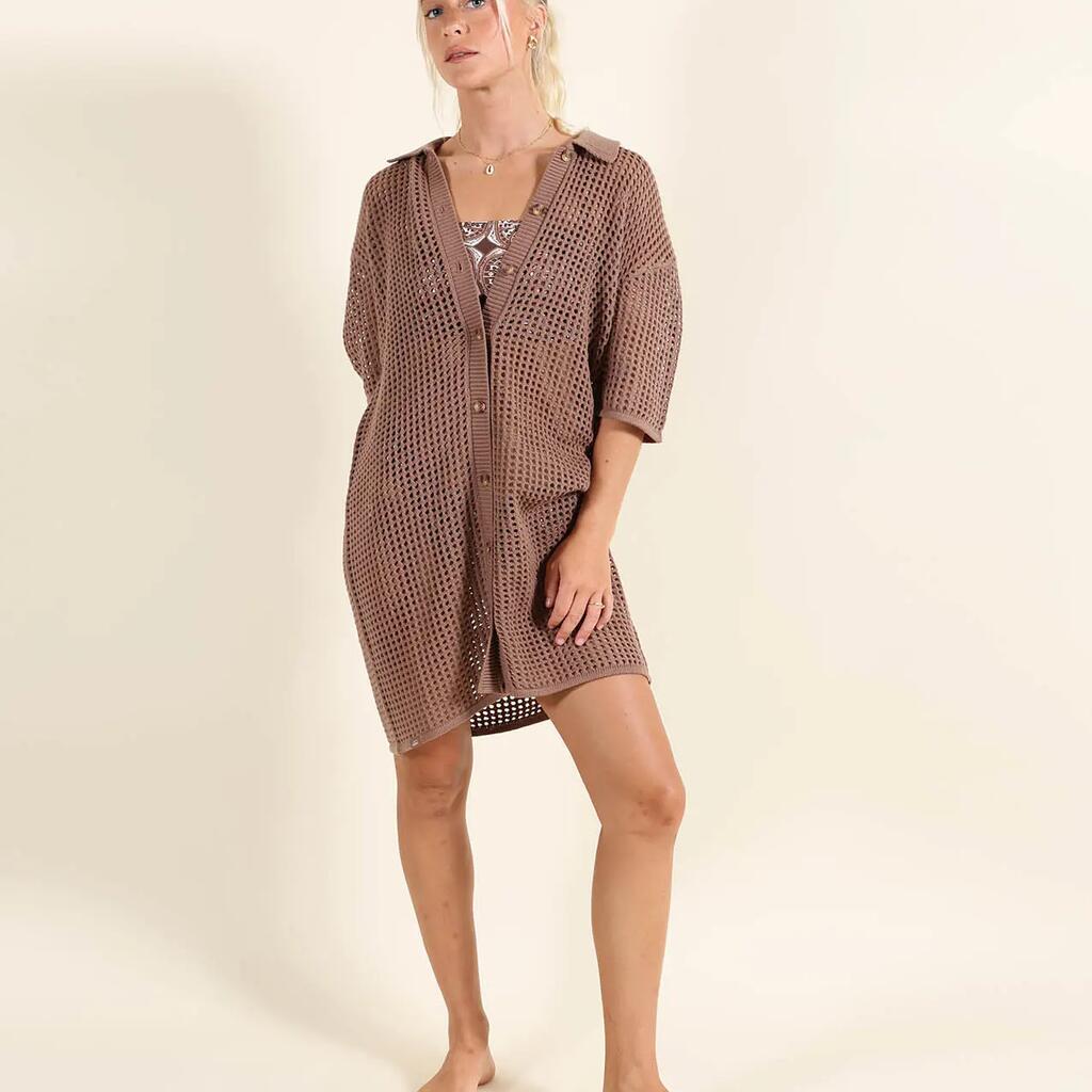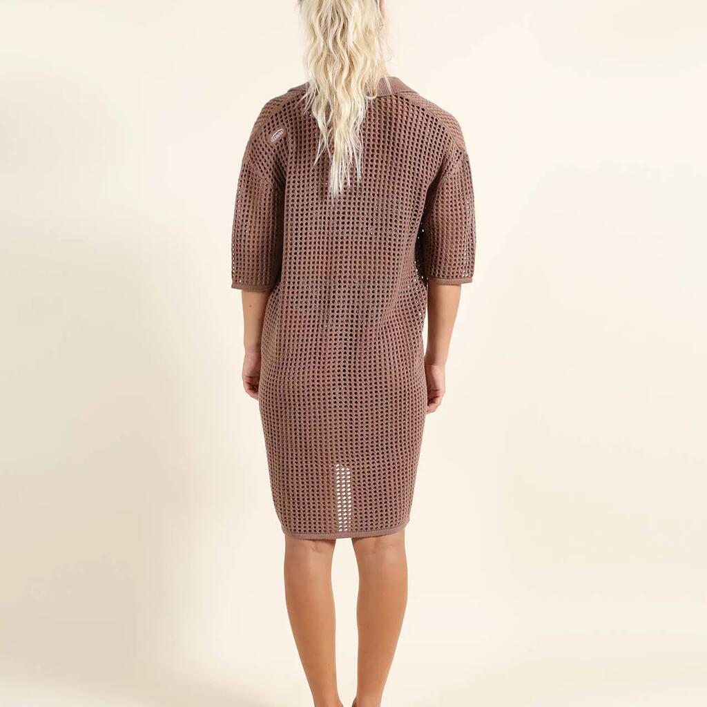 Open-knit dress with shirt collar, buttoned throughout.