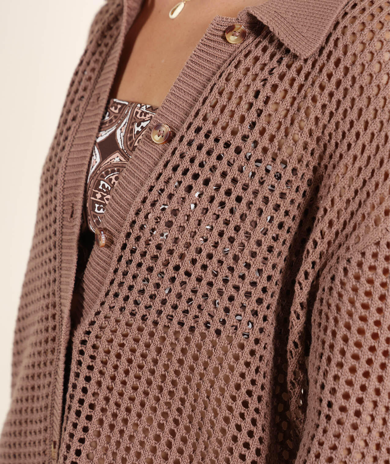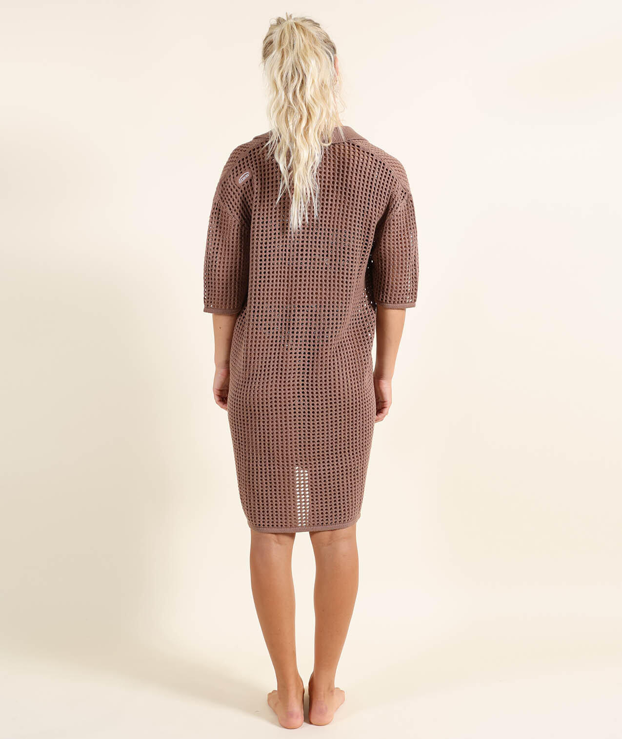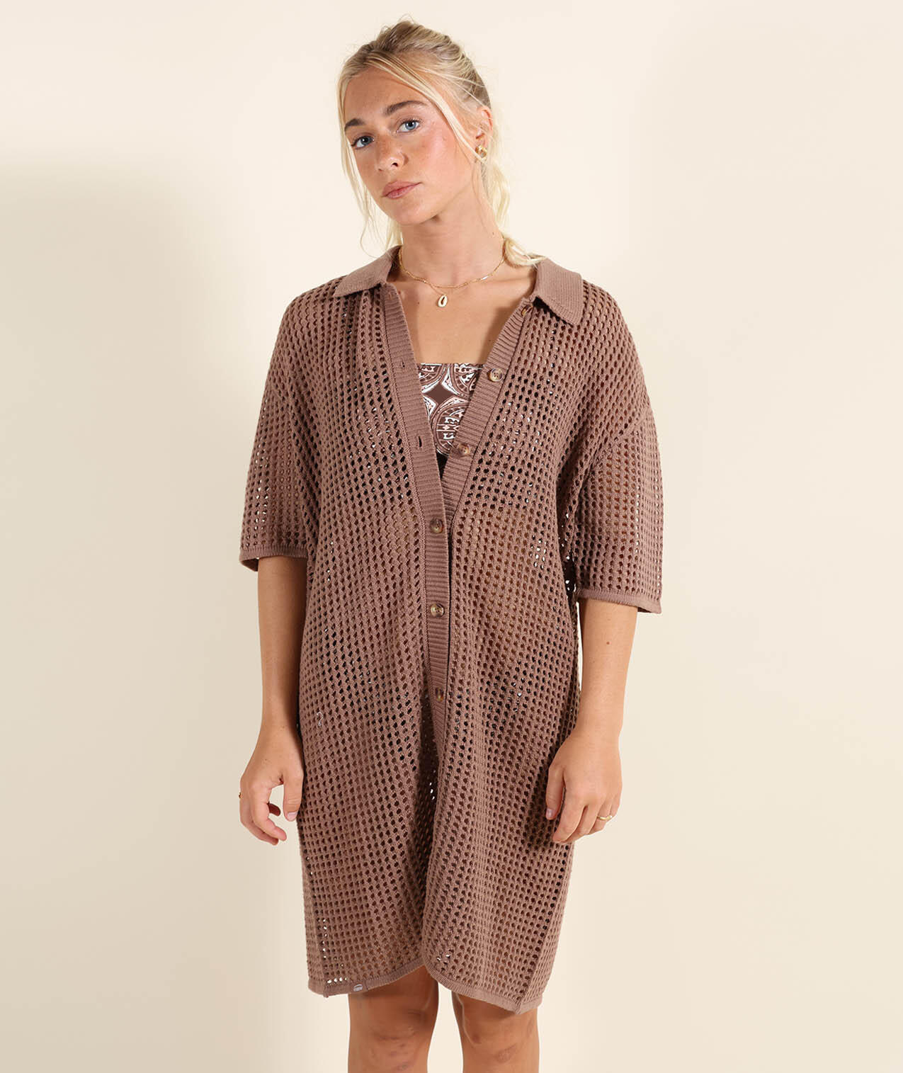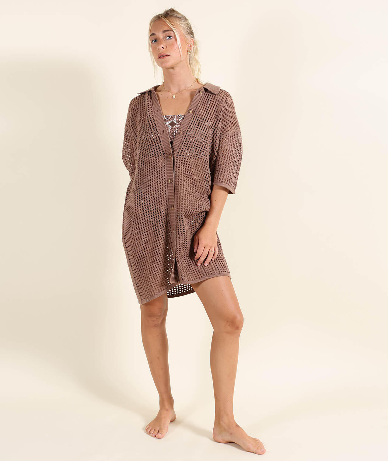 Open-knit dress with shirt collar, buttoned throughout.