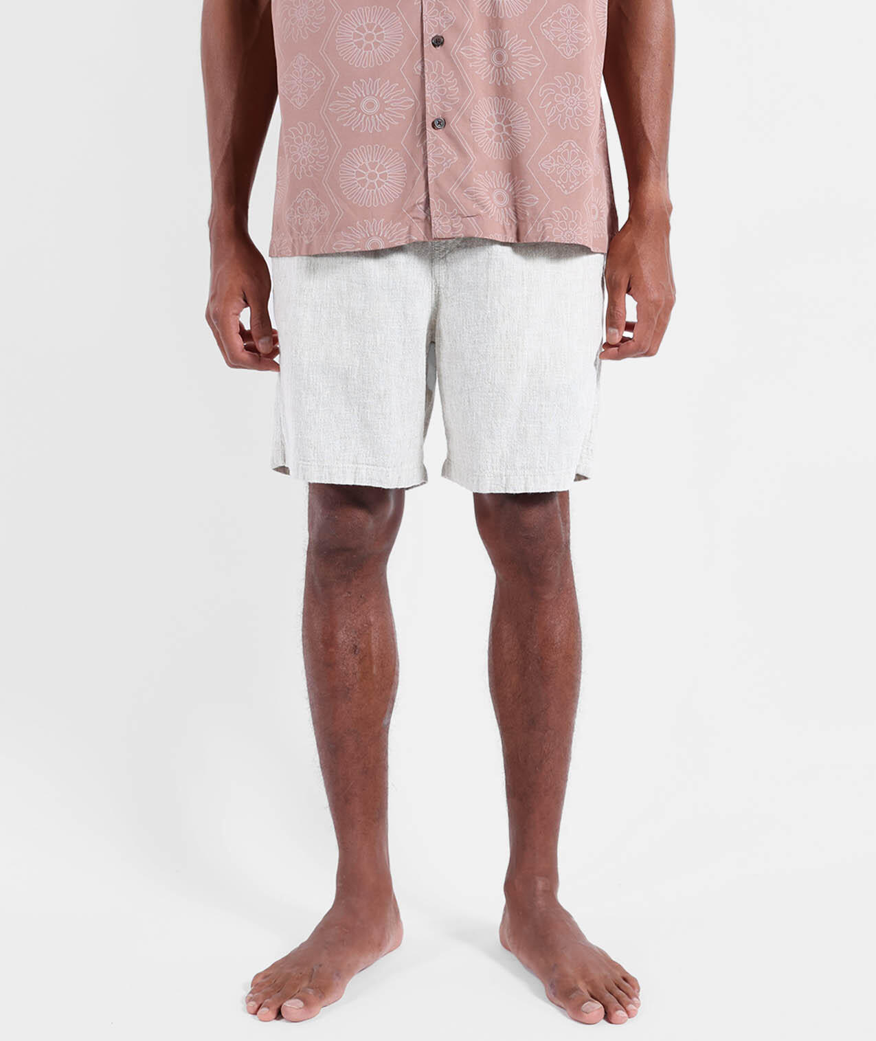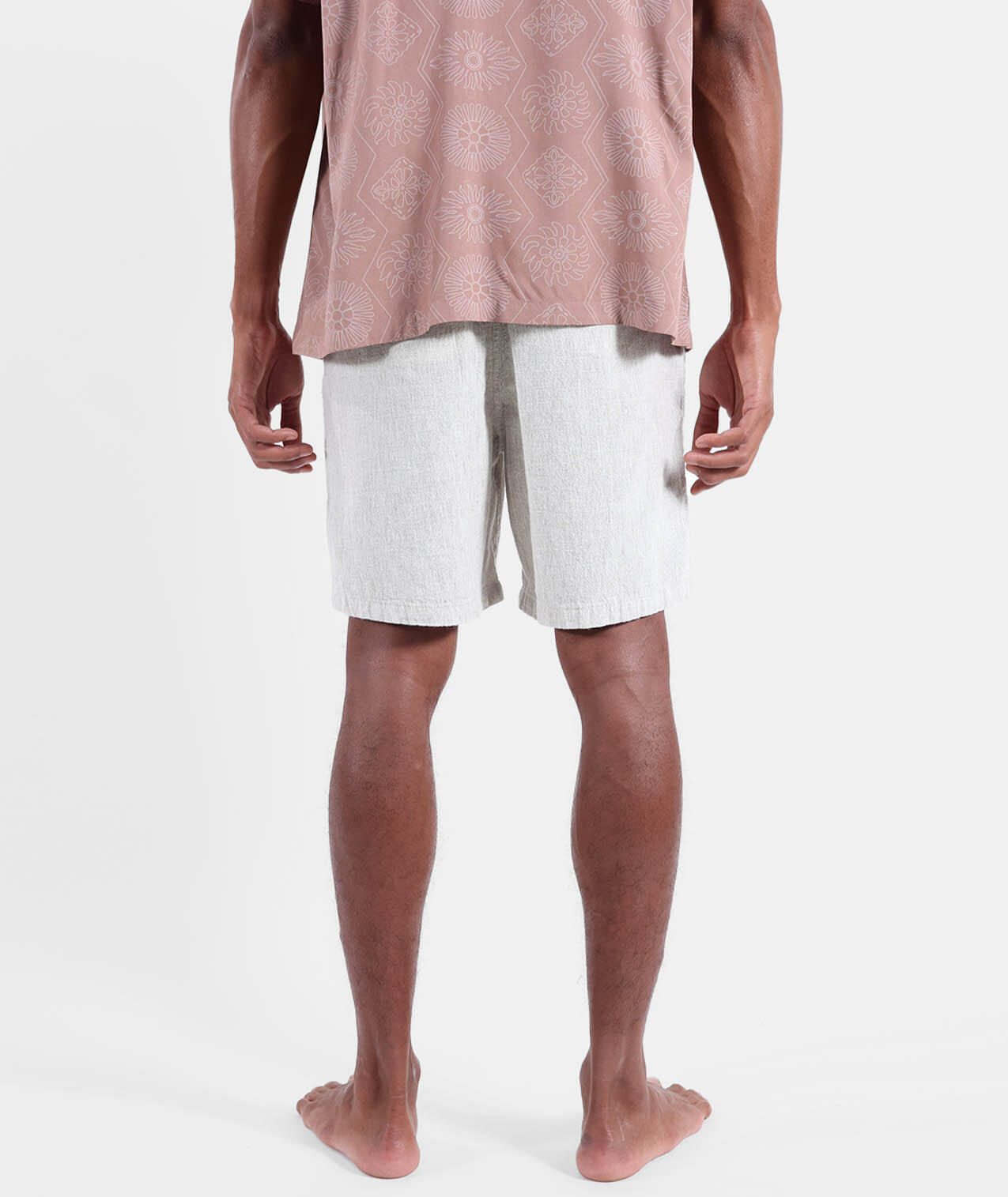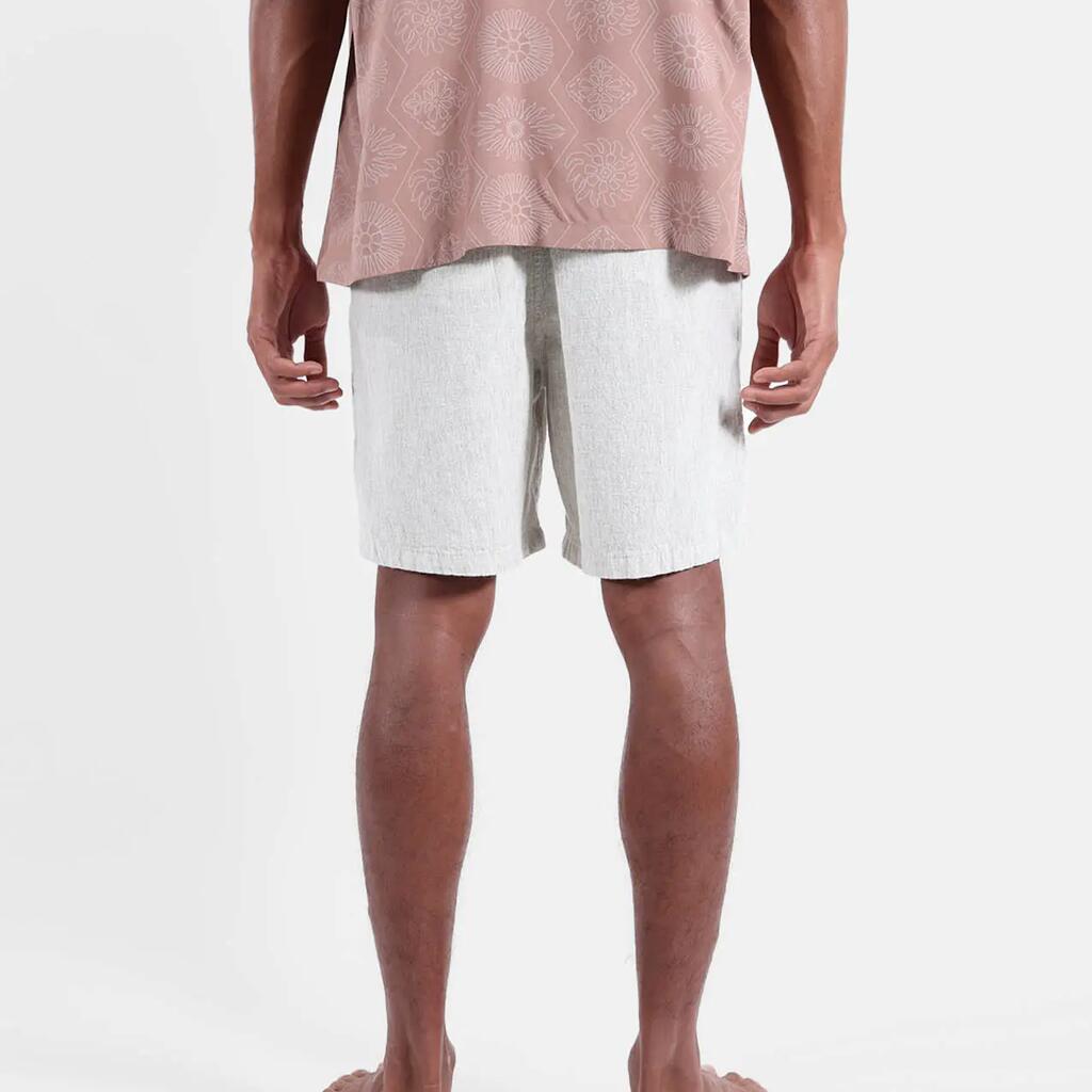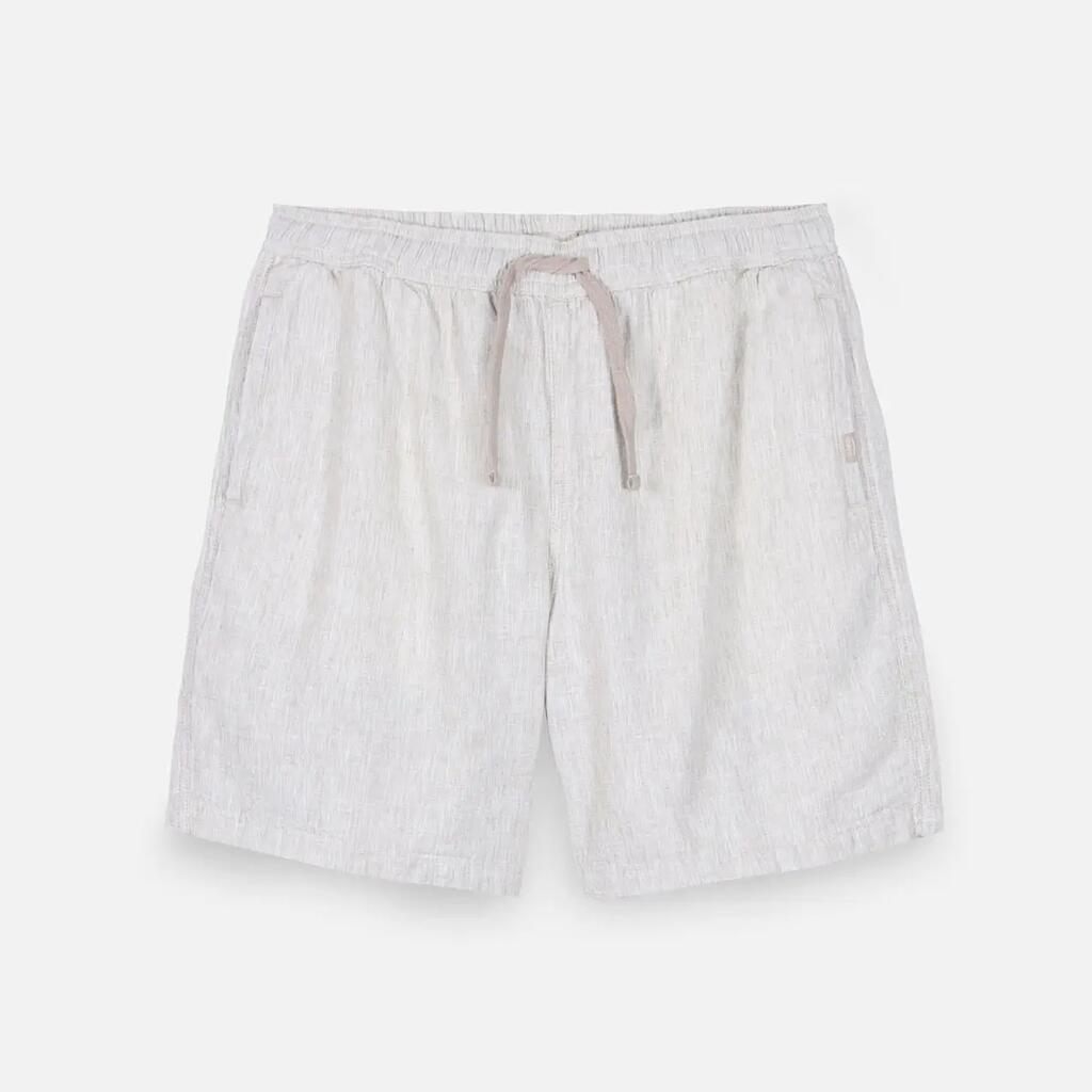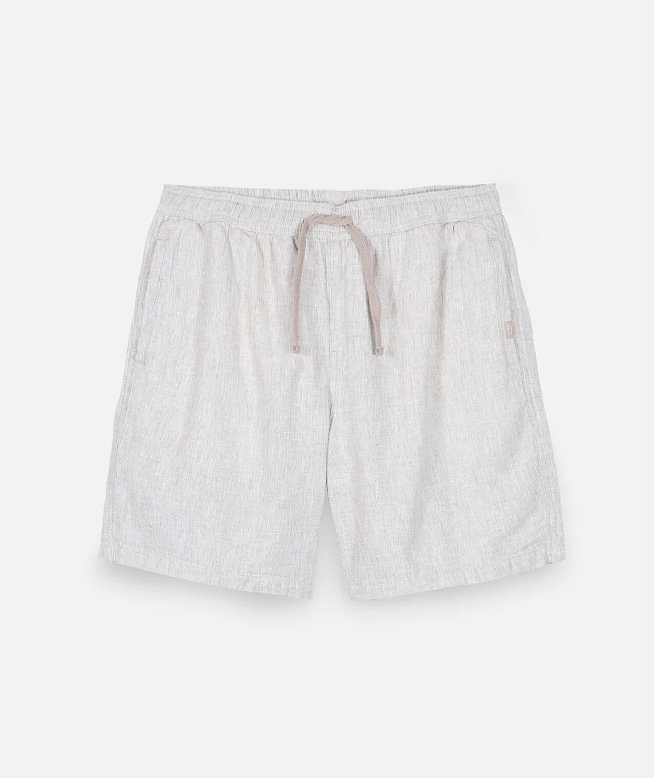 Cotton-linen elastic shorts, elastic waistband with drawstrings, faux fly, side pockets and welted back pockets, length 18''/46cm