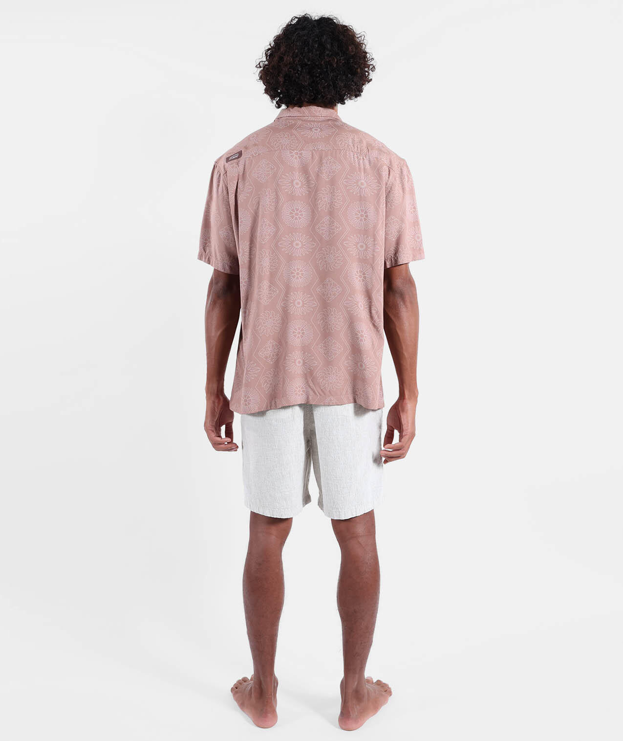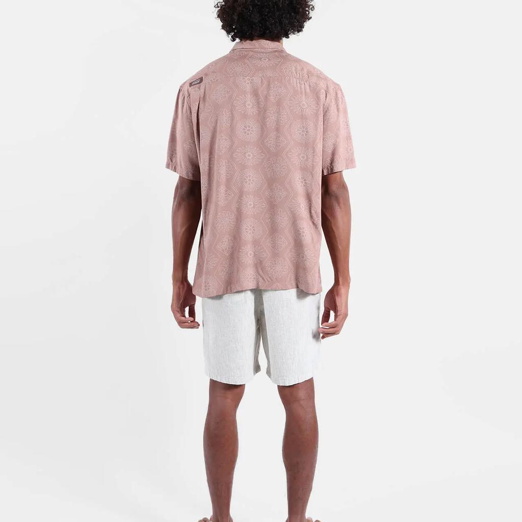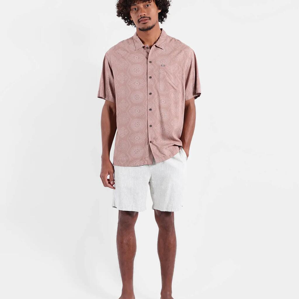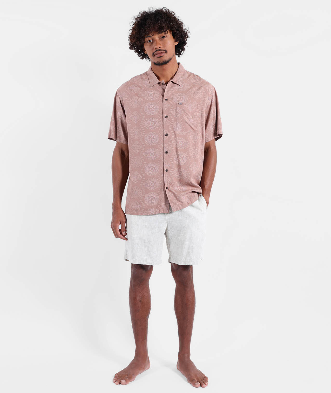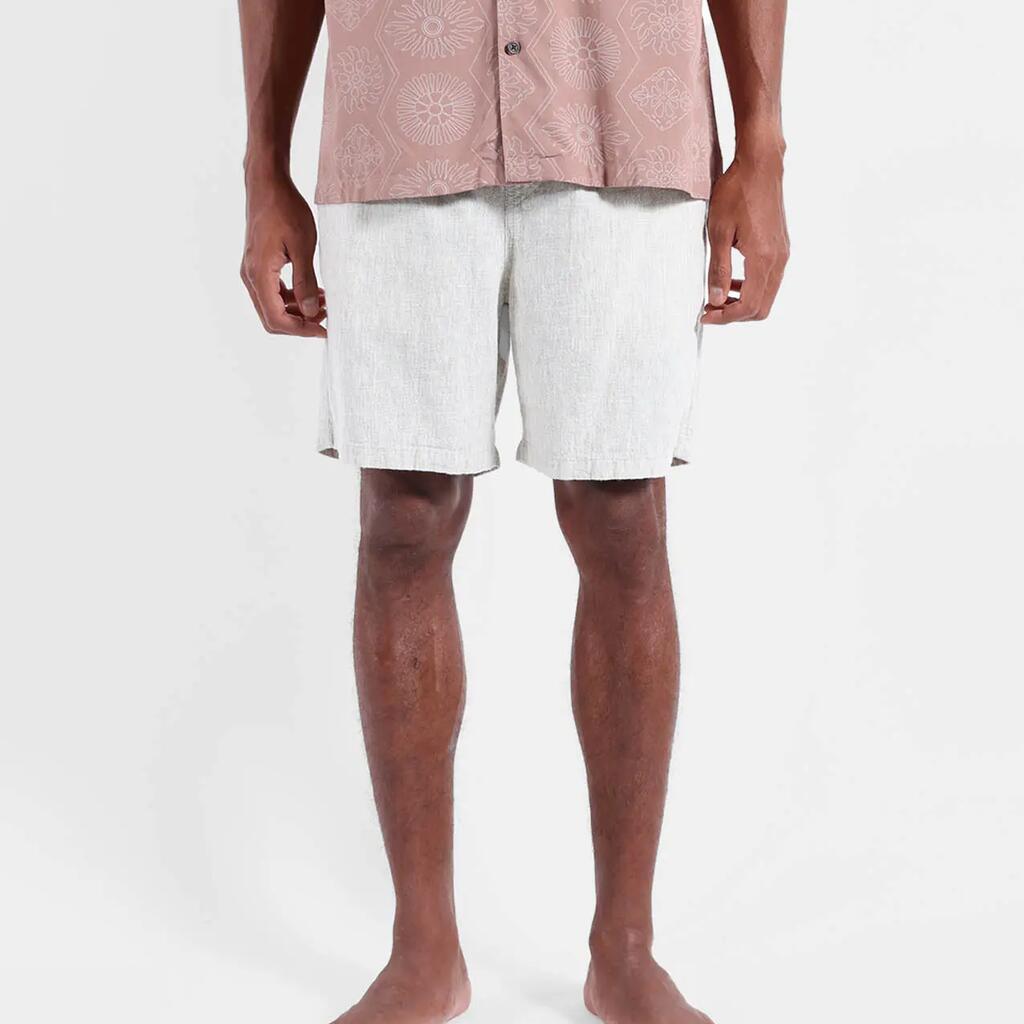 Cotton-linen elastic shorts, elastic waistband with drawstrings, faux fly, side pockets and welted back pockets, length 18''/46cm