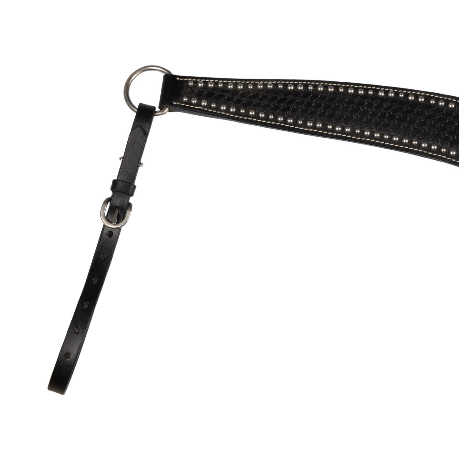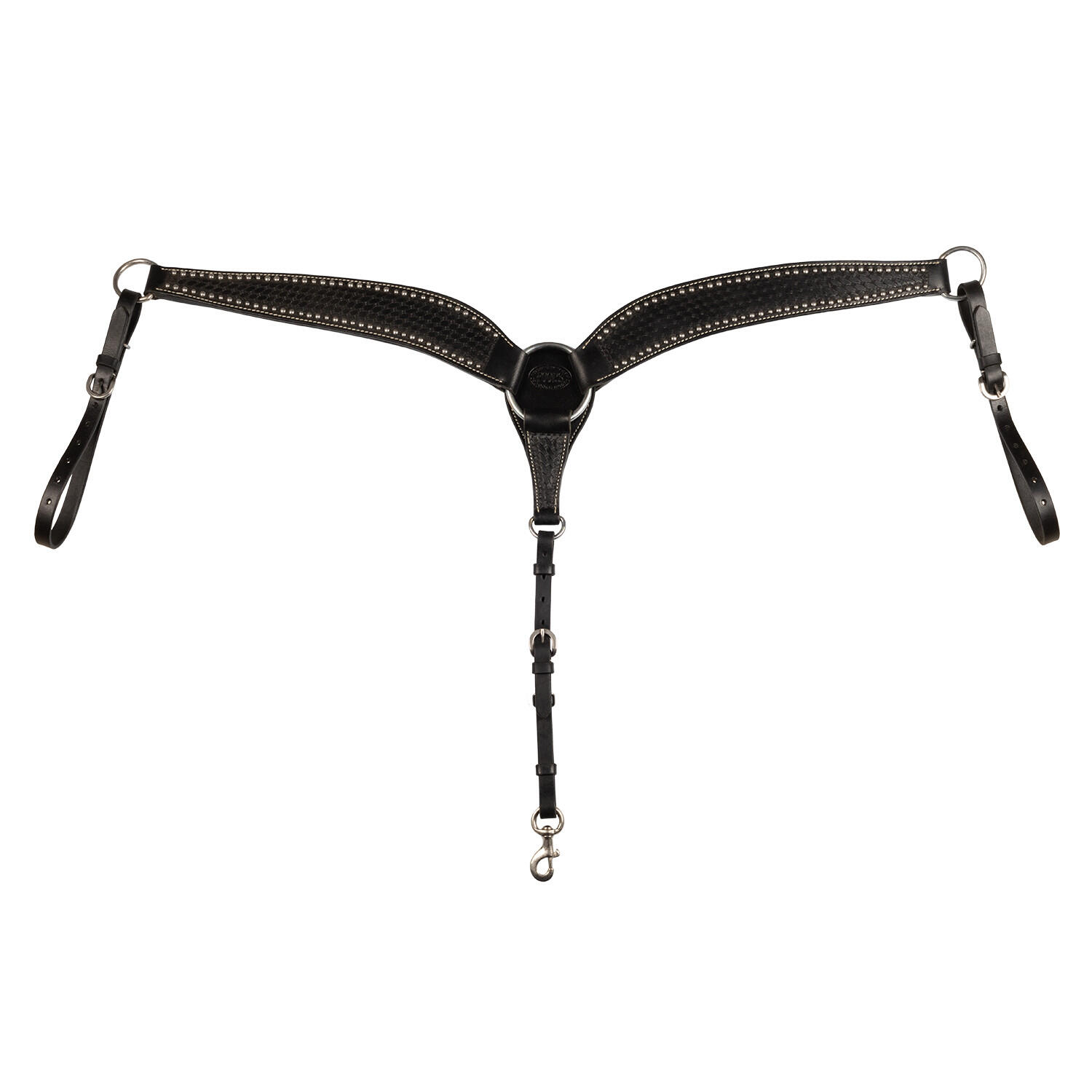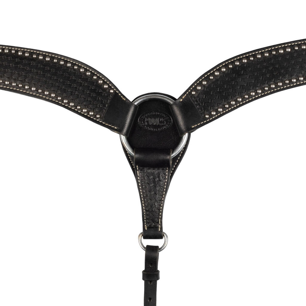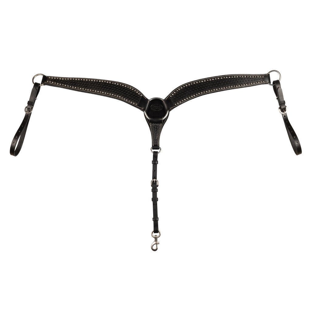 Sturdy western leather breastplate, decorated with stainless steel metal details for greater durability and authentic style in equestrian disciplines.