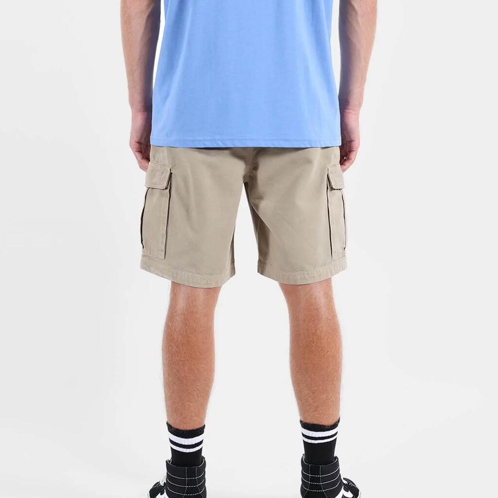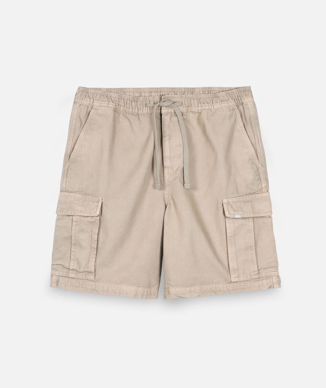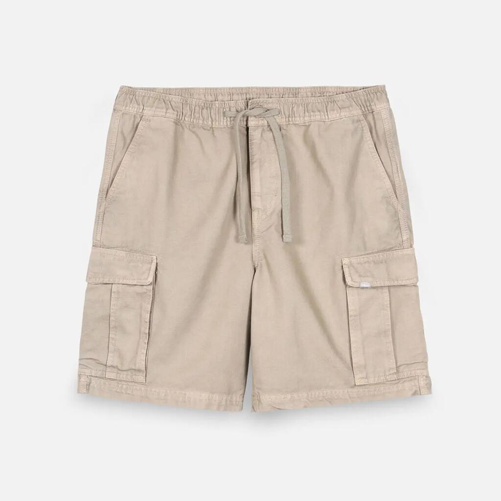 Elastic cargo shorts, elastic waistband with drawstrings and zip fly, cargo pockets, dip-dyed and washed for faded color effect, length 20''/52cm