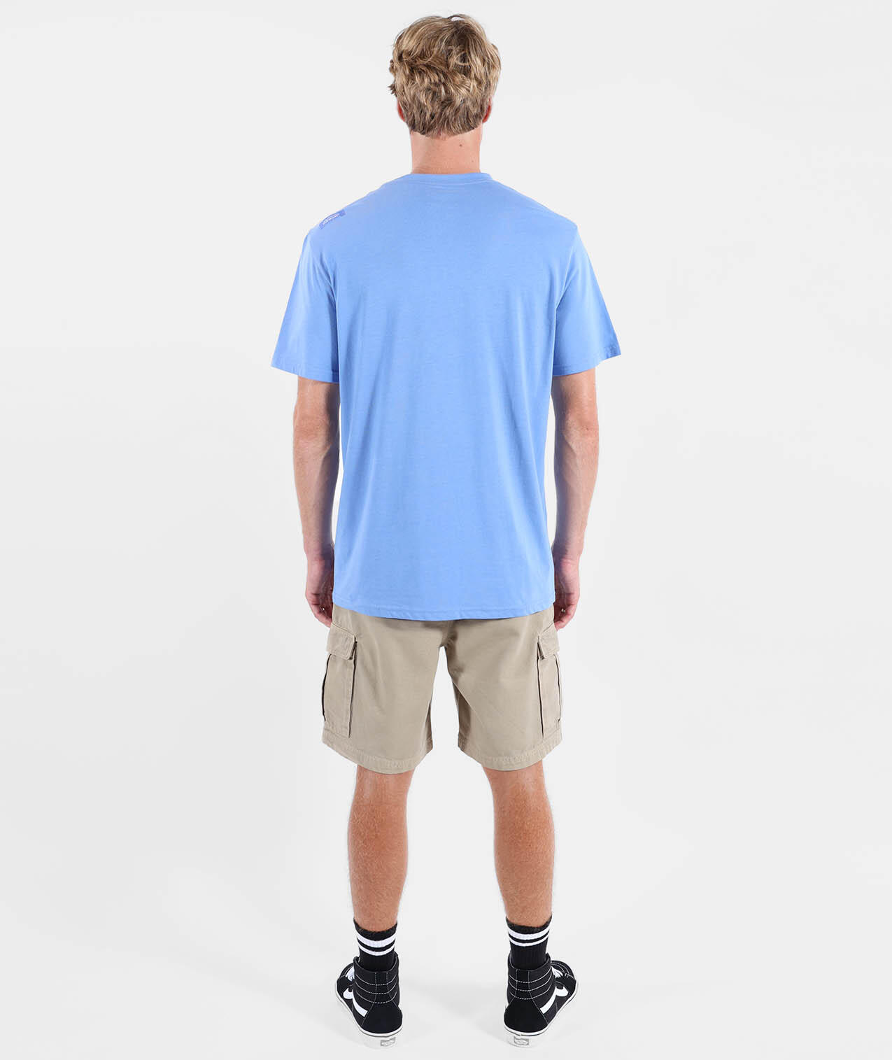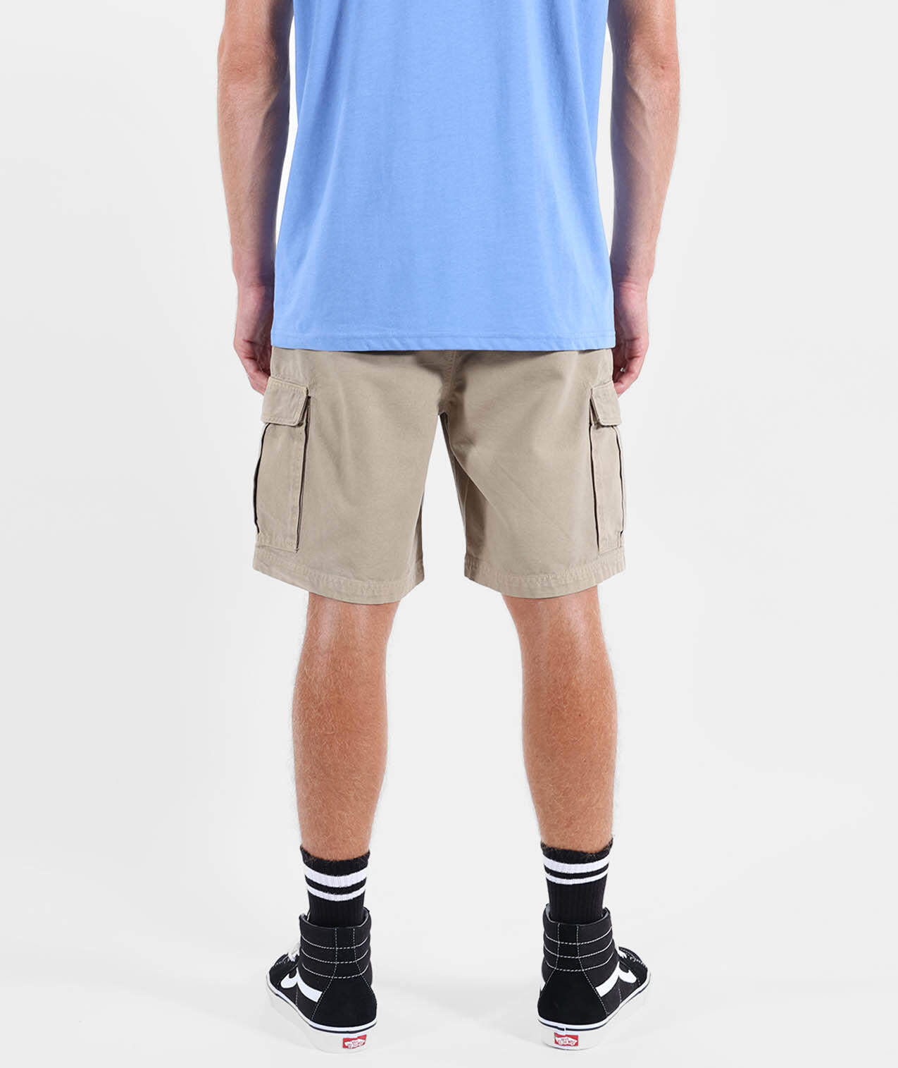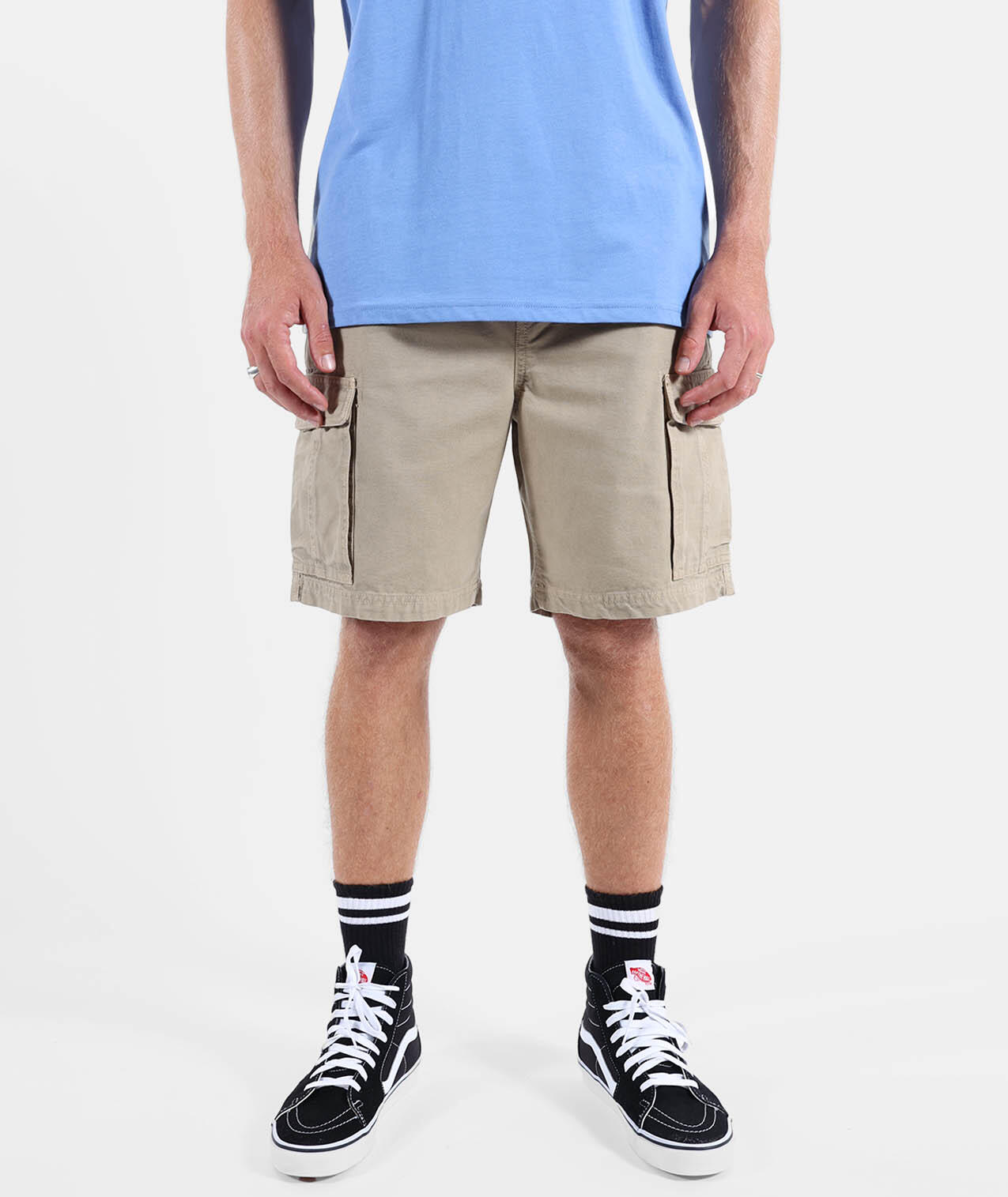 Elastic cargo shorts, elastic waistband with drawstrings and zip fly, cargo pockets, dip-dyed and washed for faded color effect, length 20''/52cm