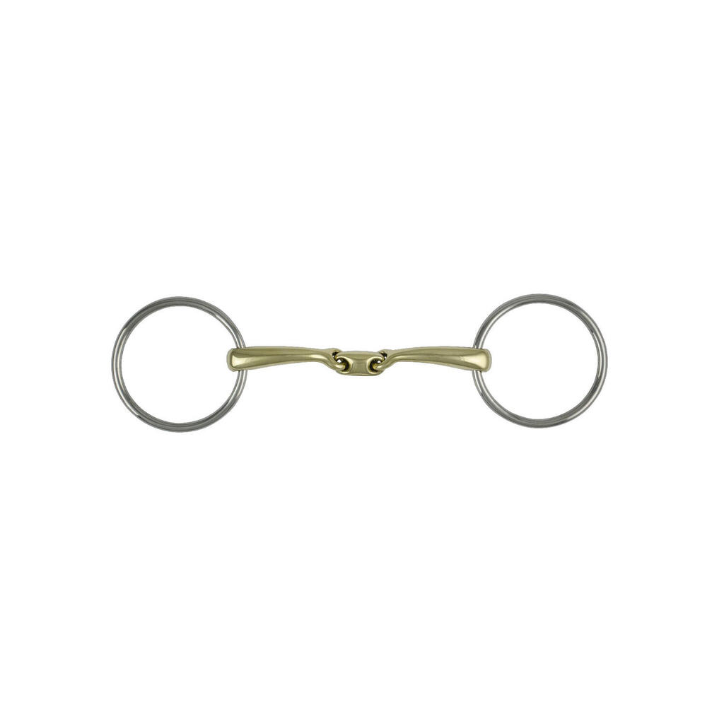 Stainless steel bit with double joint, central lozenge, and solid brass movable rings angled at 45°. Designed for maximum comfort and precision.