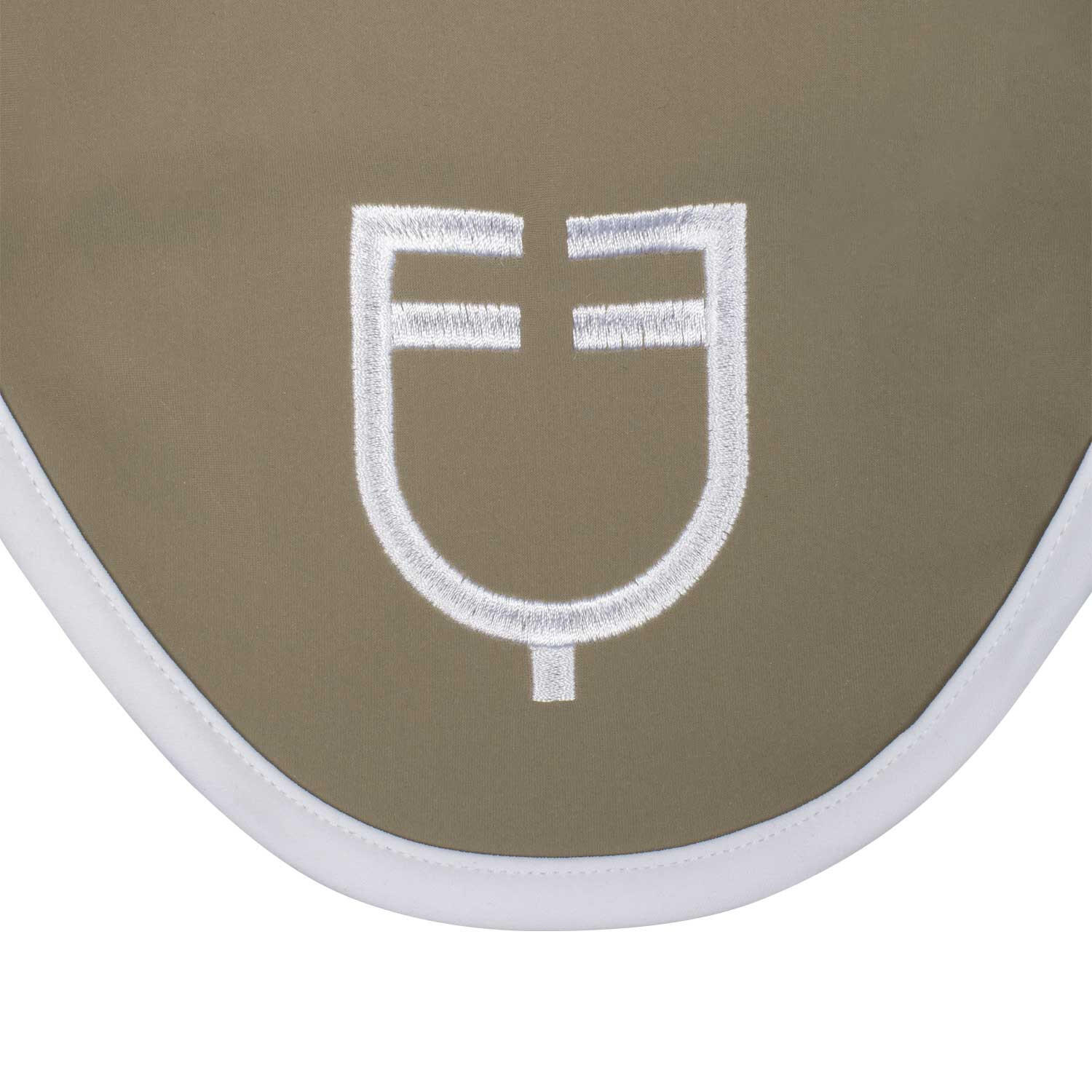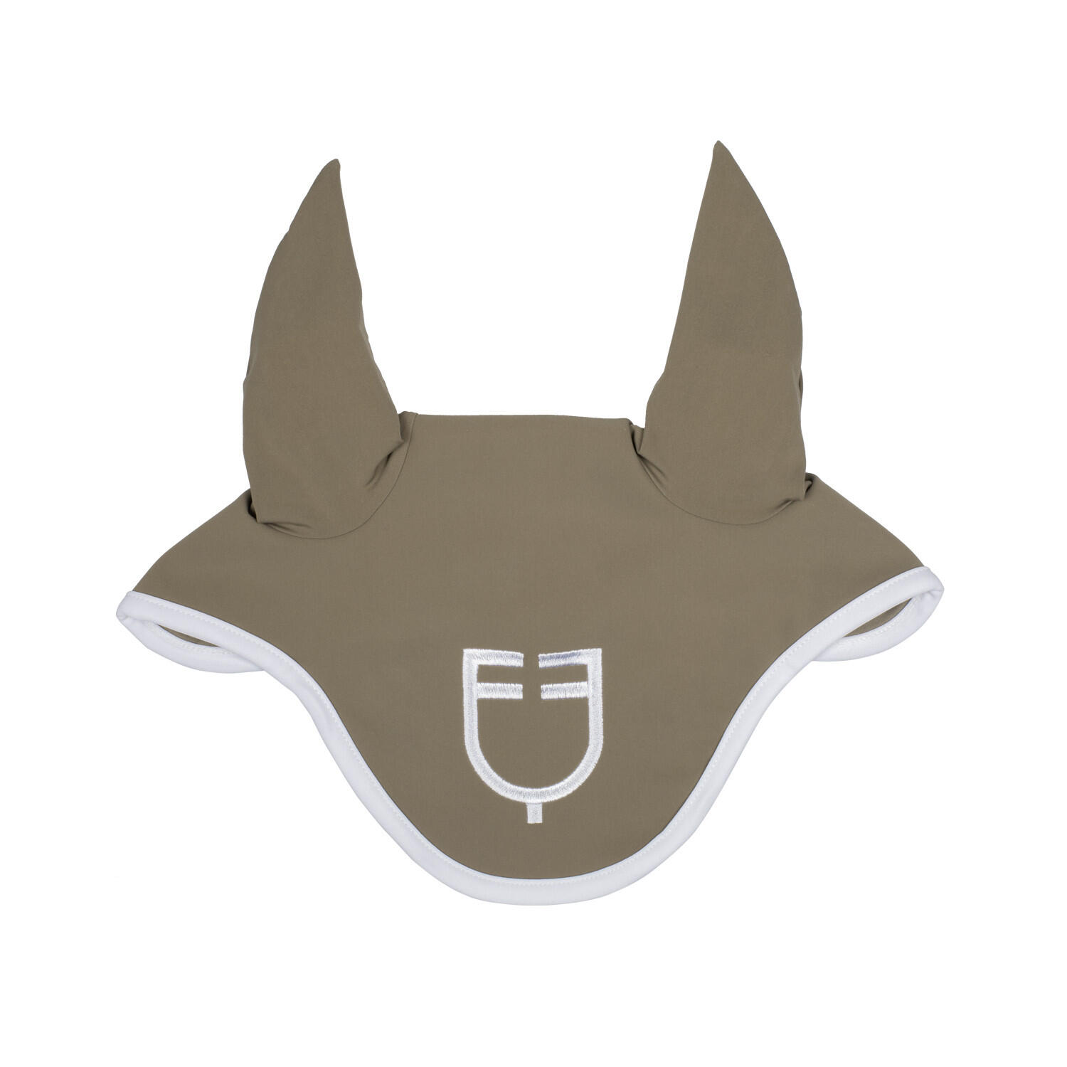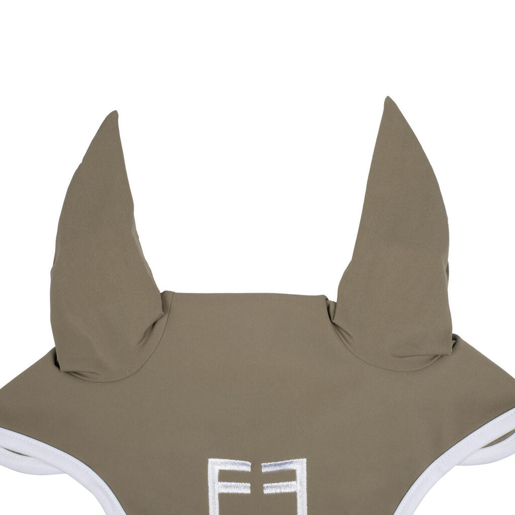 White technical ear bonnet with a comfortable fit, protects the horse from insects and reduces noise, ideal for maintaining focus during training.