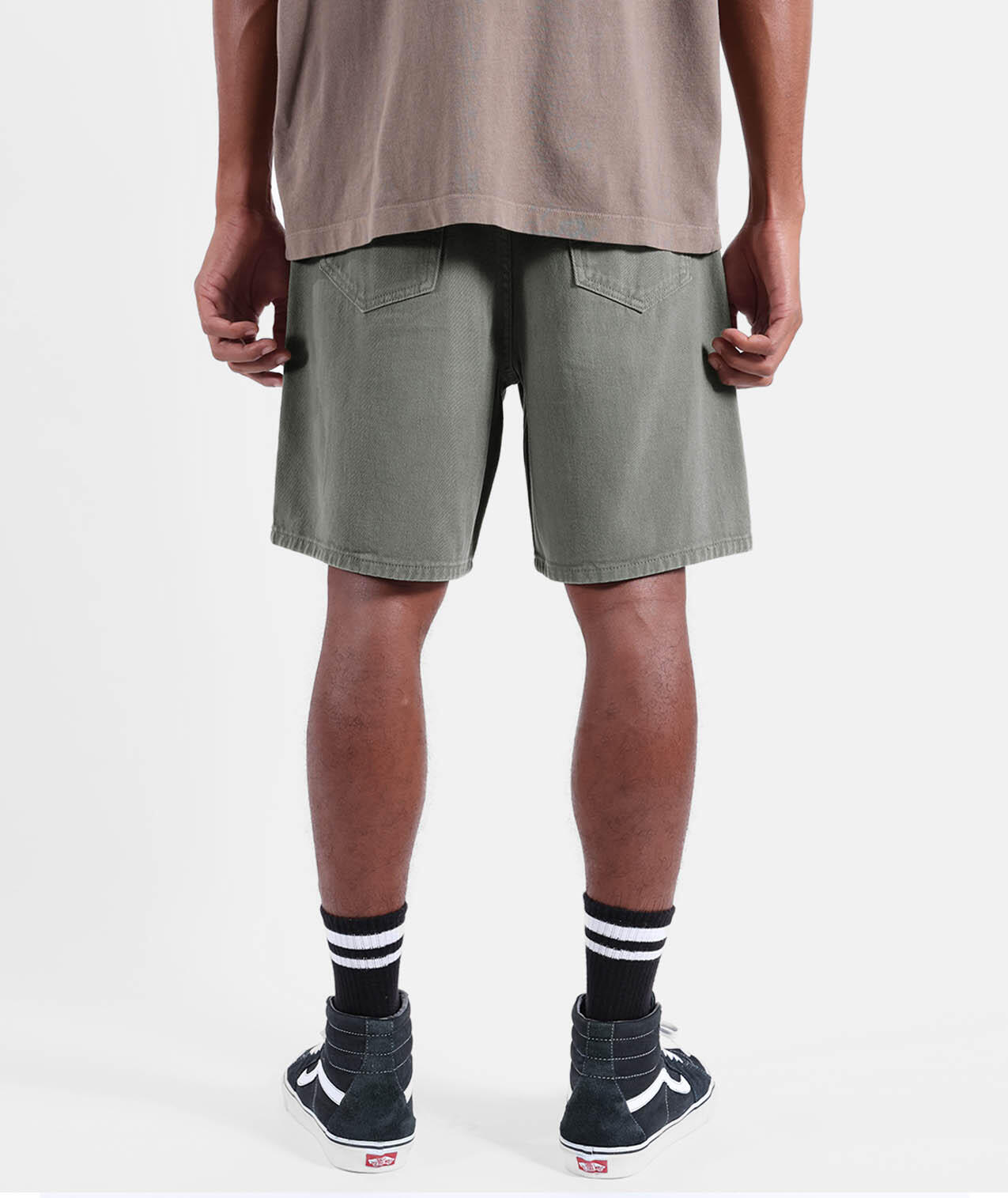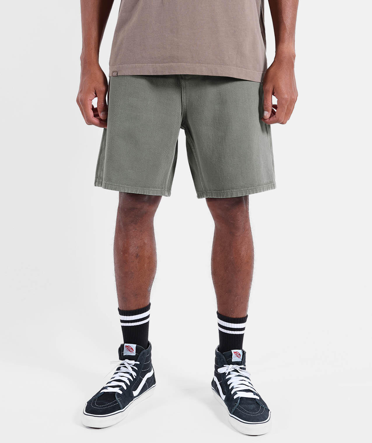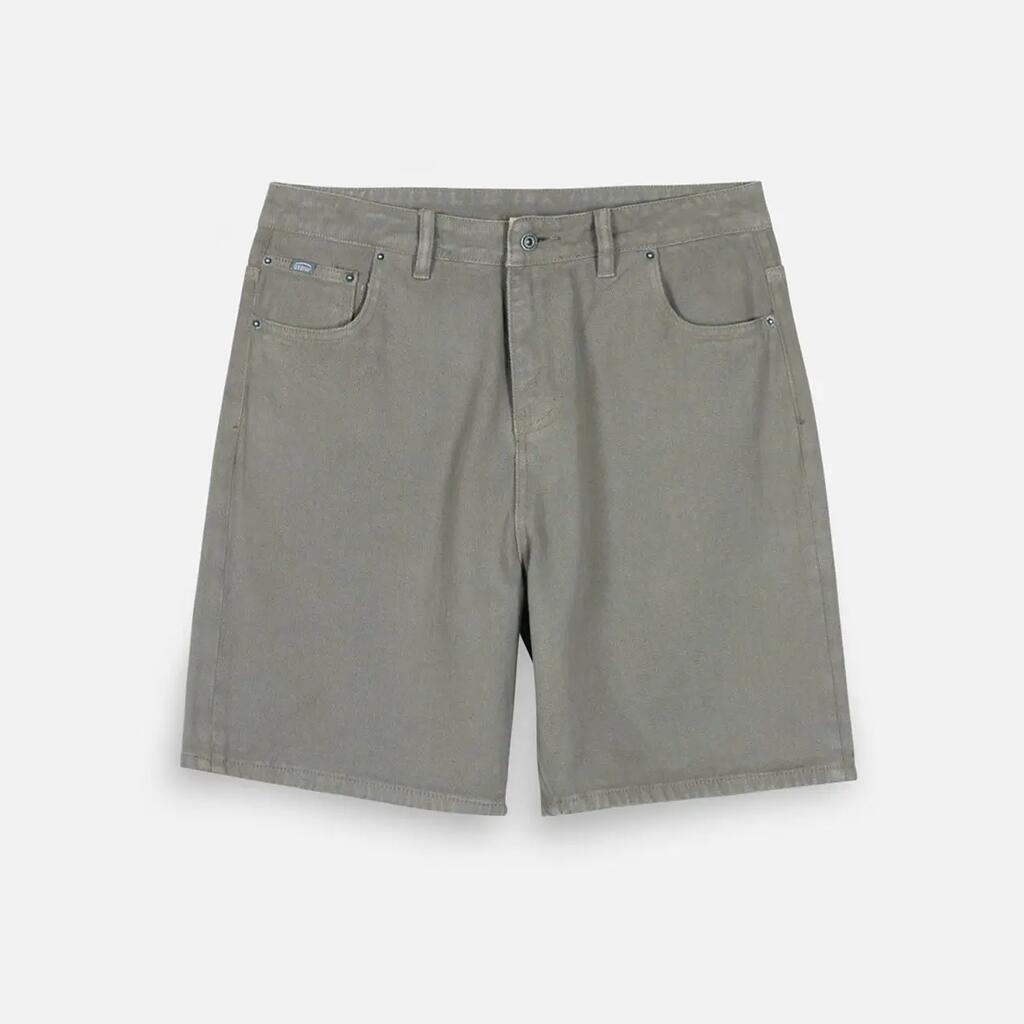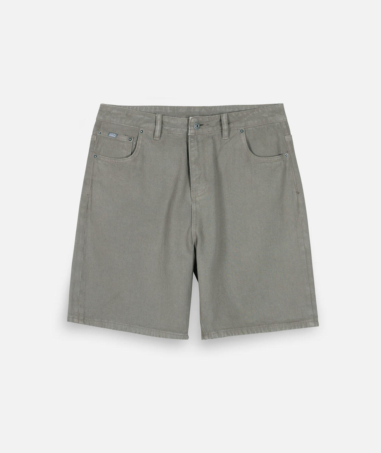 Five-pocket shorts, fixed waistband with belt loops, zip fly, side pockets and patch back pockets, thick twill fabric, dip-dyed and washed for faded color effect, length 20''/52cm