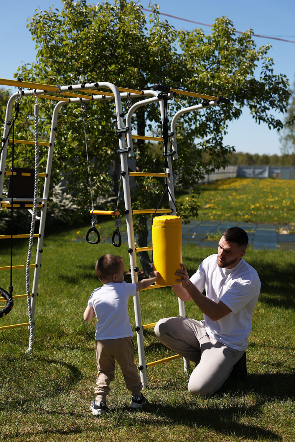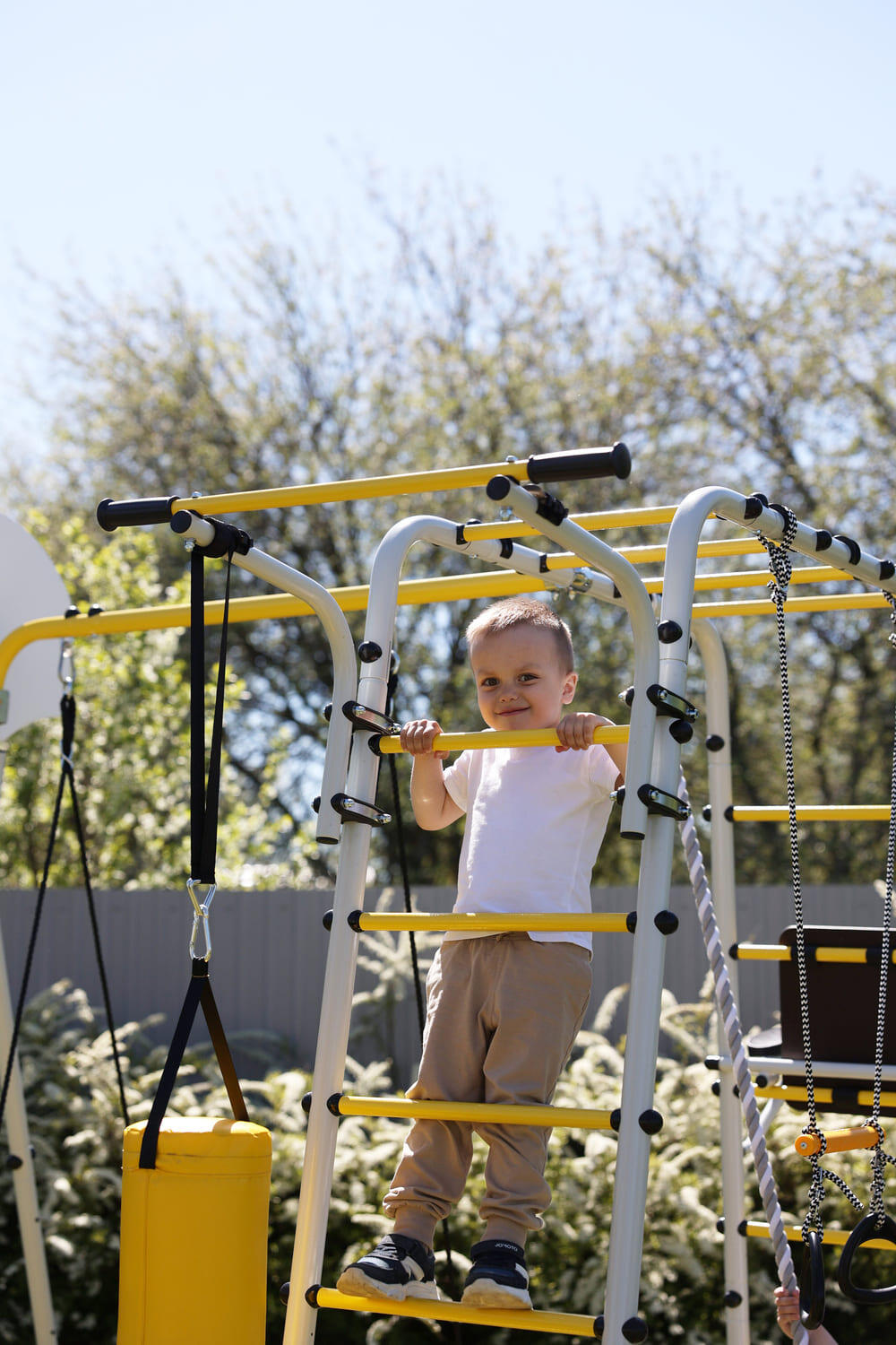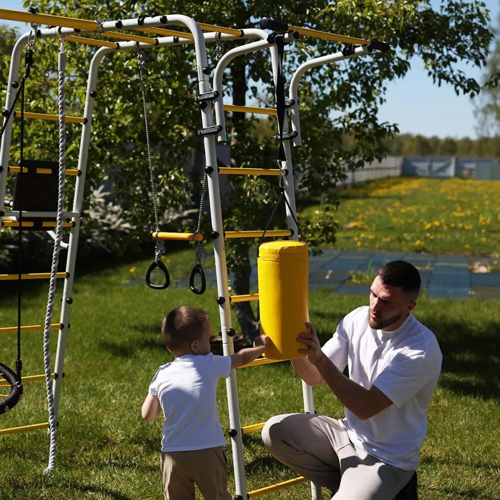 The horizontal ladder challenges endurance and arm strength as children move across while hanging from their hands. The gymnastics rope helps build muscles and improve motor skills. The set also includes gym rings with a trapeze bar for acrobatics, a basketball hoop for active play, and a punching bag for extra fun and energy release.